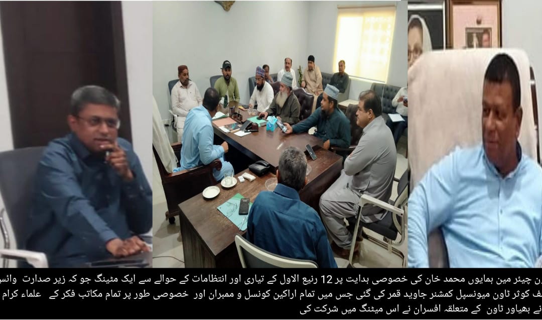 KARACHI (Digital Post) Karachi On the special directives of Mauripur Town Chairman Humayun Muhammad Khan, an important meeting was held to finalize preparations for the holy month of Rabi-ul-Awwal. The meeting was chaired by Vice Chairman Asif Kausar and Town Municipal Commissioner Javed Qamar, with participation from council members, scholars of various schools of thought, organizers, and officials from relevant departments.