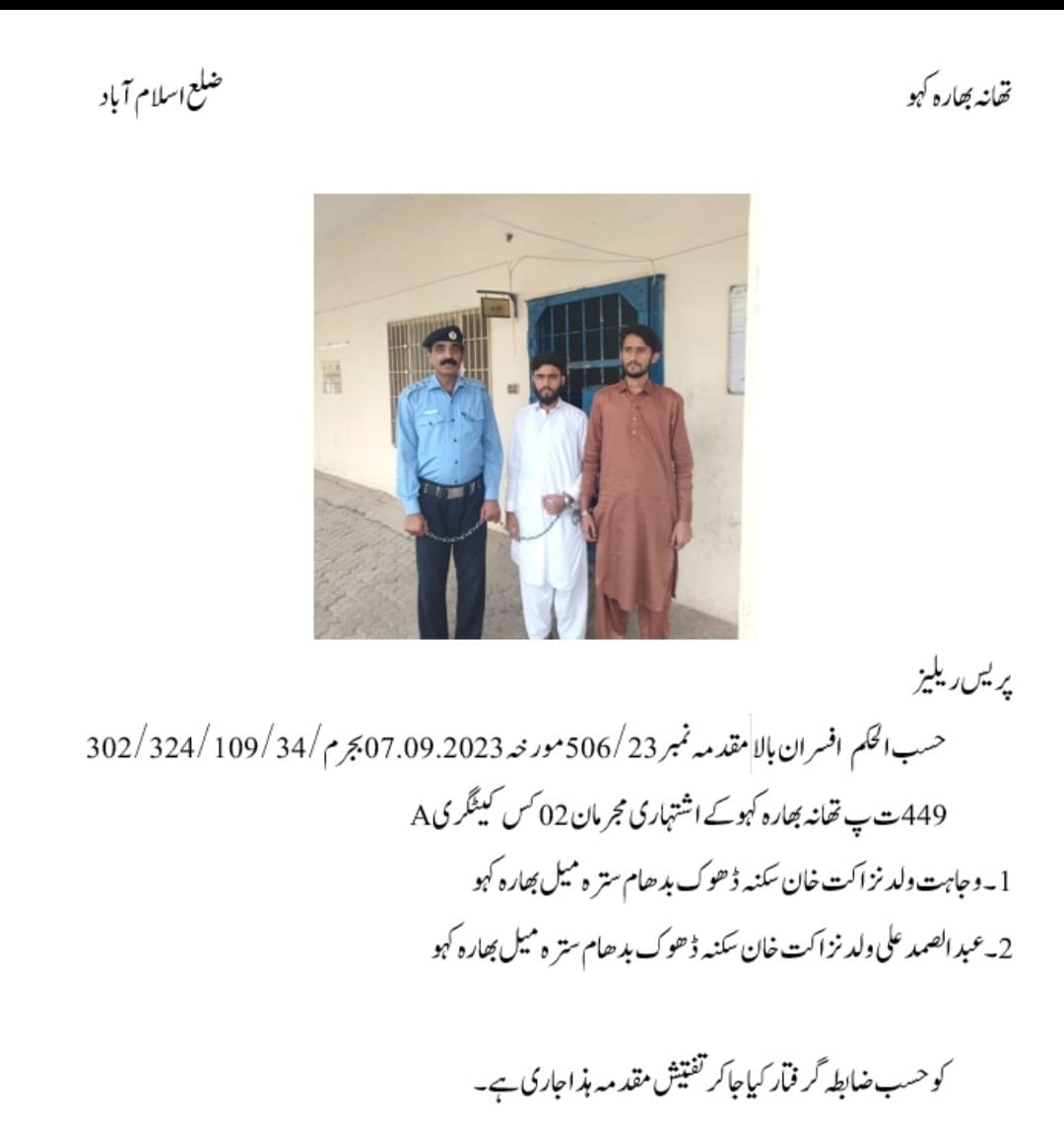 ایس ایچ او تھانہ بہارہ کہو چوہدری اختر زمان کی پہلی کامیاب کارروائی ملزمان قتل اور اقدام قتل کے مقدمے میں انتہائی مطلوب تھے چوہدری اختر زمان نے چارج سنبھالتے ہی کام کر دیکھایا جیسے کہ پہلے تھانوں میں دکھاتے ائے ہیں منشیات فروشوں اور علاقے کا سکون برباد کرنے والے لوگوں کے لیے سخت خطرہ ہیں اور عوام کا بھرپور تعاون بی حاصل ہے اس افسر کو