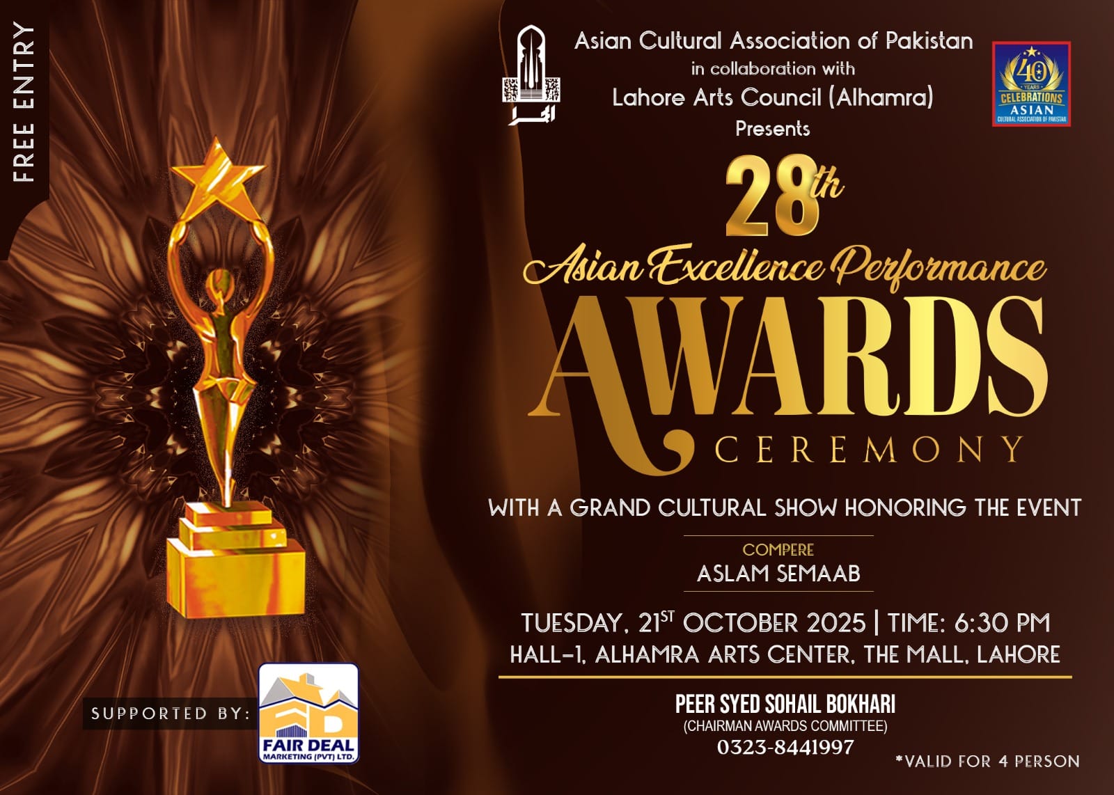 لاہور (ڈیجیٹل پوسٹ) ایشین کلچرل ایسوسی ایشن آف پاکستان کے سیکرٹری جنرل و چیئرمین ایوارڈز کمیٹی پیر سید سہیل بخاری نے بتایا ہے کہ 28 – ویں ایشین ایکسی لینس پرفارمنس ایوارڈز کی تقریب لاہور آرٹس کونسل الحمراء کے تعاون سے آج 21 ، اکتوبر 2025ء شام 6 ، بجے منعقد کی جا رہی ھے – جس میں زندگی کے ہر شعبہ کی شخصیات کو انکی اعلٰی کارکردگی پر ایوارڈز سے نوازا جائے گا – پیر سید سہیل بخاری نے مزید بتایا کہ سماجی و ثقافتی شخصیات اور زندگی کے ہر شعبہ سے نمایاں افراد و شخصیات شریک ہونگیں – ایک میگا ثقافتی پروگرام بھی تقریب کا حصہ ہوگا جس میں ملک کے نامور فنکار ، گلوکار اور گلوکارہ ،کامیڈین و قوال پرفارم کریں گے – علاوہ ازیں صوفی پرفارمنس ، علاقائی رقص ، دھمال ، ڈھول پرفارمنس بھی تقریب کا حصہ ھونگے – وفاقی و صوبائی وزراء ، سپیکر پنجاب اسمبلی ، ممبران قومی و صوبائی اسمبلی مہمانان خصوصی ھونگے