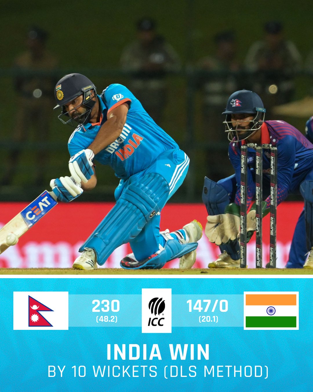 ایشیا کپ کے پانچویں میچ میں بھارت نے نیپال کو 10 وکٹوں سے شکست دے دی۔ پالی کیلے میں ہونے والے میچ میں بھارت نے ٹاس جیت کر فیلڈنگ کا فیصلہ کیا تھا۔ نیپال کی ٹیم 48.2 اوورز میں 230 رنز بناکر آل آؤٹ ہوگئی۔بارش کے باعث بھارت کی بیٹنگ 2.1 اوورز میں 17 رنز پر روک دی گئی تھی اور تاخیر کی وجہ سے بھارت کو ڈک ورتھ لوئس میتھڈ کے تحت 23 اوورز میں 145 رنز کا ہدف دیا بھارت نے ٹاس جیت کر فیلڈنگ کا فیصلہ کیا تھا۔ نیپال کی ٹیم 48.2 اوورز میں 230 رنز بناکر آل آؤٹ ہوگئی۔ بارش کے باعث بھارت کی بیٹنگ 2.1 اوورز میں 17 رنز پر روک دی گئی تھی اور تاخیر کی وجہ سے بھارت کو ڈک ورتھ لوئس میتھڈ کے تحت 23 اوورز میں 145 رنز کا ہدف دیا گیا۔ بھارت نے 145 رنز کا ہدف 20.1 اوورز میں بغیر کسی وکٹ کے نقصان پر حاصل کرلیا۔ روہت شرما نے 74 اور شبمن گل نے 67 رنز بنائے۔ قبل ازیں پہلے بیٹنگ کرتے ہوئے نیپال کے اوپنر کشال بھرتیل نے 38 اور آصف شیخ نے 58 رنز کے ساتھ ٹیم کو عمدہ آغاز فراہم کیا تھا۔ نیپال کی پہلی وکٹ 65 رنز پر گری جبکہ 77 رنز پر دوسرا کھلاڑی بھی پویلین لوٹ گیا۔ نیپال کی تیسری وکٹ 93 رنز اور چوتھی وکٹ 101 رنز پر گری۔سومپال کامی 48، کشال بھرتیل 38 رنز کے ساتھ نمایاں رہے۔ بھارت کی طرف سے محمد سراج اور رویندرا جدیجا نے 3، 3 جبکہ محمد شامیہارڈیک پانڈیا، شرڈل ٹھاکر نے ایک ایک کھلاڑی کو آؤٹ کیا۔ بھارتی ٹیم نے فیلڈنگ کے دوران تین کیچز بھی چھوڑے۔ بھارتی ٹیم نے جسپریت بمراہ کی جگہ محمد شامی کو ٹیم میں شامل کیا ہے۔