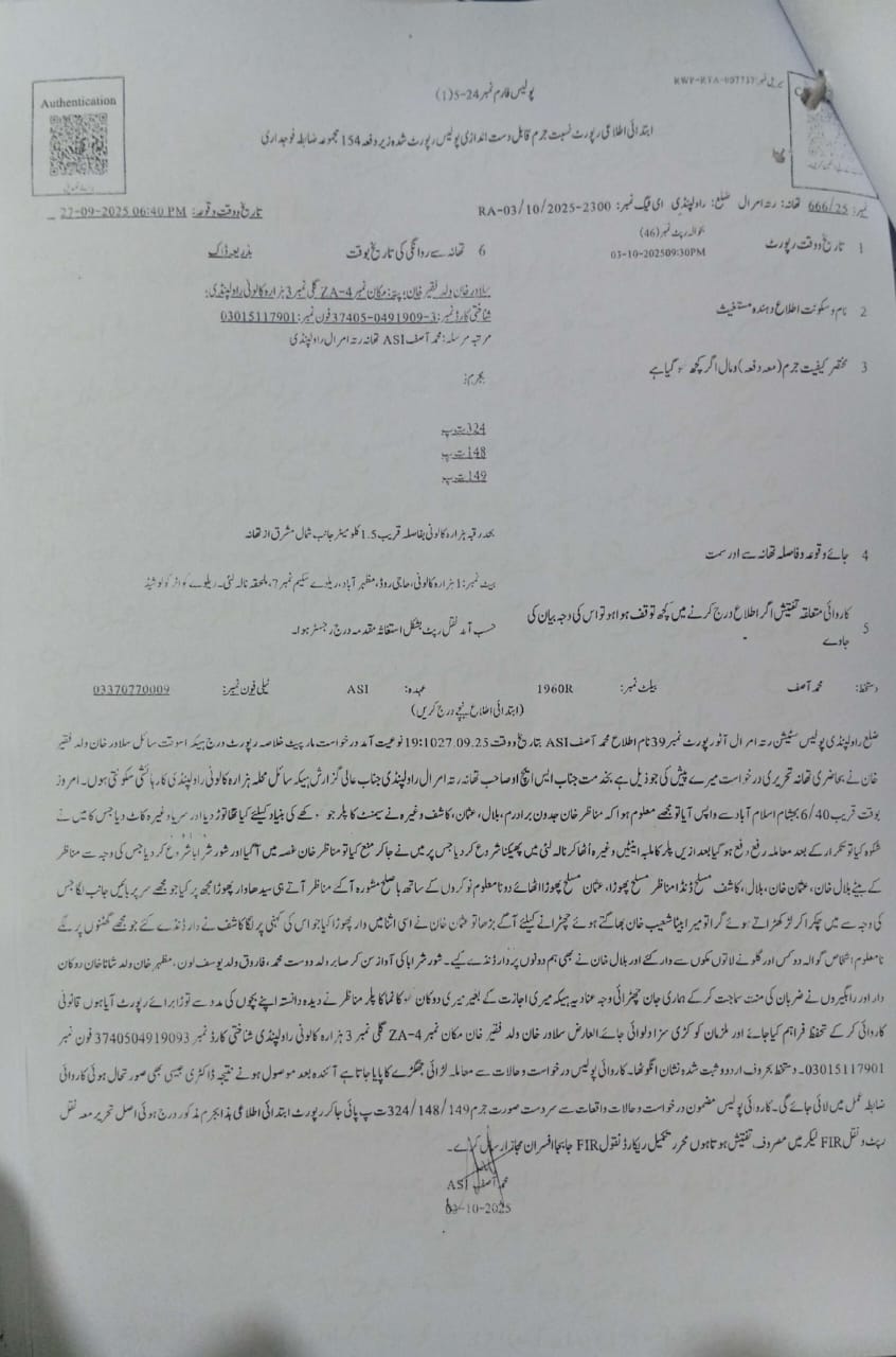 (نامعلوم تاریخ) تھانہ رتہ امرال میں درج سنگین نوعیت کے مقدمہ نمبر 666/25 بجرم 324/337Fv/337Lii/337Aii/148/149 میں تبدیلی تفتیش کے بعد نئے تفتیشی افسر انسپکٹر عامر خالد صاحب کی تعیناتی پر مدعی مقدمہ نے رشوت کے ذریعے ملزم کو ریلیف دینے کی مبینہ کوششوں کا انکشاف کیا ہے۔