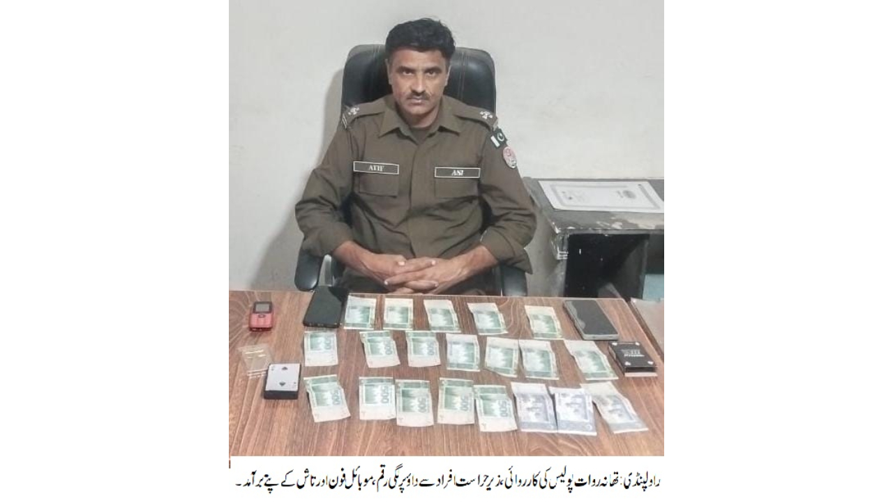 راولپنڈی (ڈیجیٹل پوسٹ)(مظہر شاہ)ایس ایچ او تھانہ روات زاہد ظہور کی سربراہی میں پولیس ٹیم کی کارروائی، تاش کے پتوں پر جواء کھیلنے والے 3 افراد گرفتار،داؤ پر لگی رقم 11 ہزار 500 روپے،3 موبائل فون اور تاش کے پتے برآمد۔تفصیلات کے مطابق تھانہ روات پولیس نے کارروائی کرتے ہوئے تاش کے پتوں پر جواء کھیلنے والے 3 افراد کو گرفتار کرلیا،داؤ پر لگی رقم 11 ہزار 500 روپے،3 موبائل فون اور تاش کے پتے برآمدہوئے،روات پولیس نے مقدمہ درج کرکے گرفتار کرلیا،ایس پی صدر انعم شیر کاکہنا تھا کہ قمار بازی دیگر معاشرتی برائیوں کی جڑ ہے۔