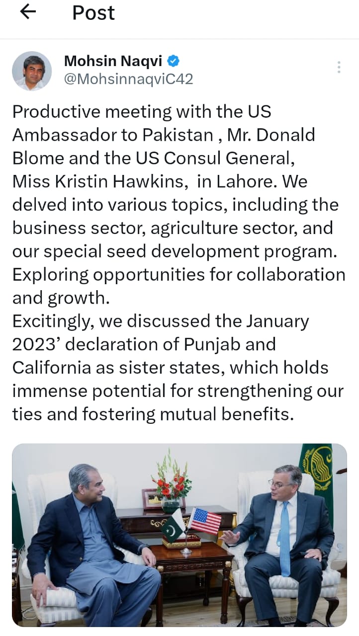 زراعت خصوصا سیڈ ڈویلپمنٹ کے حوالے سے کیلیفورنیا کے تجربے سے استفادہ کرنا چاہتے ہیں۔محسن نقوی