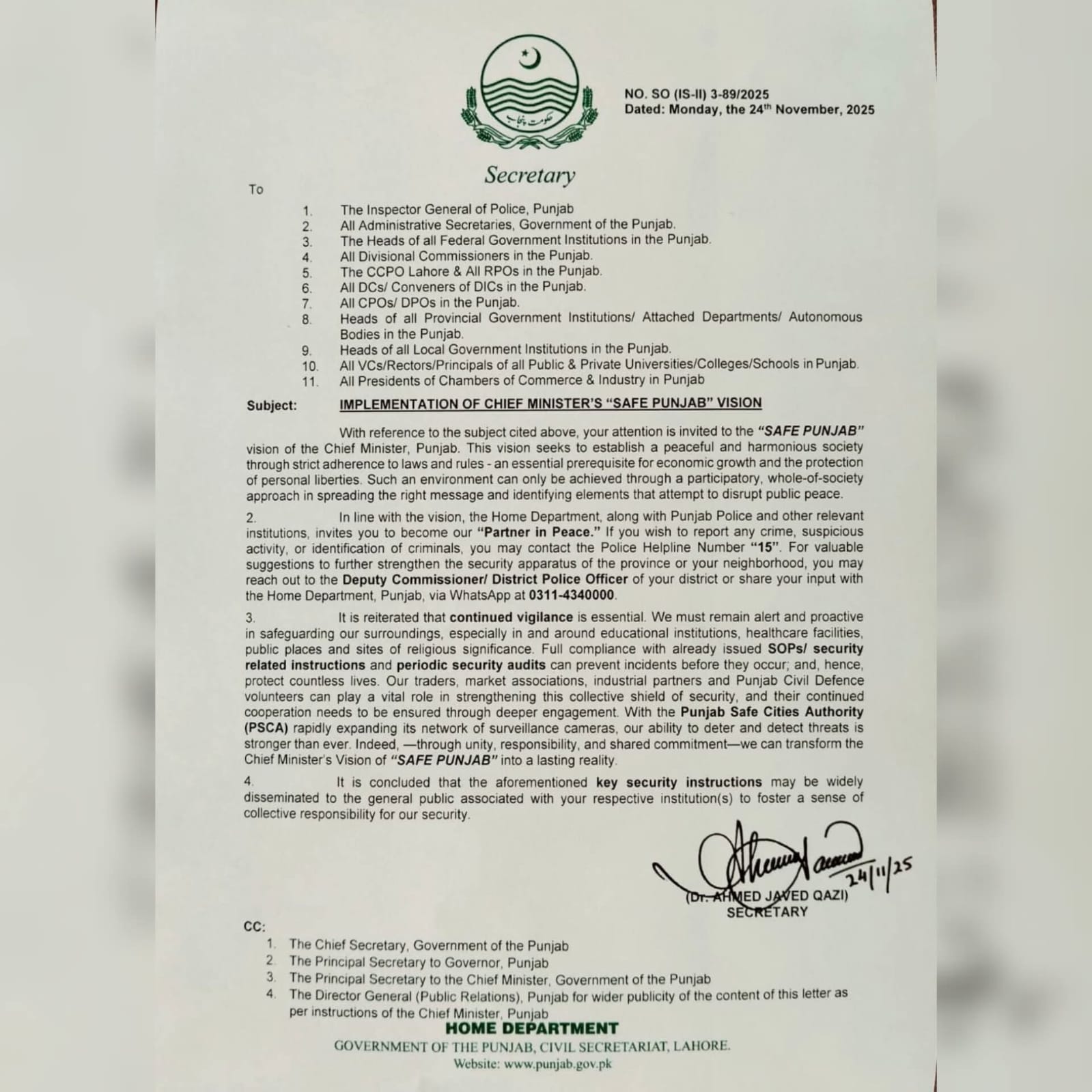 راولپنڈی (ڈیجیٹل پوسٹ) وزیراعلیٰ پنجاب کے “سیف پنجاب” وژن پر عملدرآمد وزیراعلی پنجاب کی ہدایت پر محکمہ داخلہ نے امن و امان کے قیام کے حوالے سے اہم مراسلہ جاری کر دیا جس کے ذریعے تمام اداروں اور عوام کو “پارٹنر اِن پیس” بننے کی دعوت دی گئی ہے۔ سکیورٹی کے حوالے سے مفید تجاویز کیلئے محکمہ داخلہ نے واٹس ایپ نمبر 03114340000 جاری کیا ہے جس پر شہری امن عامہ میں بہتری بارے قیمتی تجاویز تحریری طور پر بھجوا سکتے ہیں۔ شہری جرائم کی اطلاع، مشکوک سرگرمی یا ایمرجنسی کی صورت میں ہیلپ لائن “15” پر ہی رابطہ کریں گے
