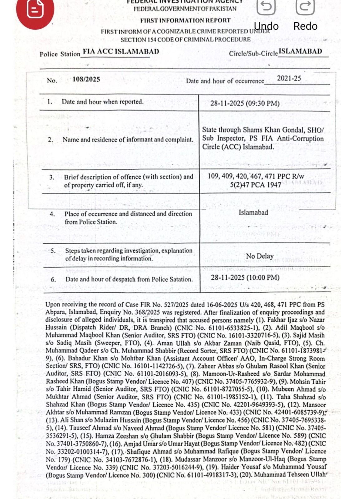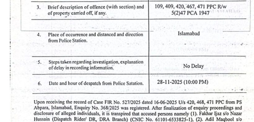 اسلام آباد (ڈیجیٹل پوسٹ) مذکورہ مقدمہ فیڈرل انویسٹی گیشن ایجنسی اسلام آباد نے ایک ایف آئی آر نمبر 527/2025 (جو 16 جون 2025 کو تھانہ آبپارہ میں درج ہوا تھا) کی انکوائری کے نتیجے میں درج کیا ہے۔