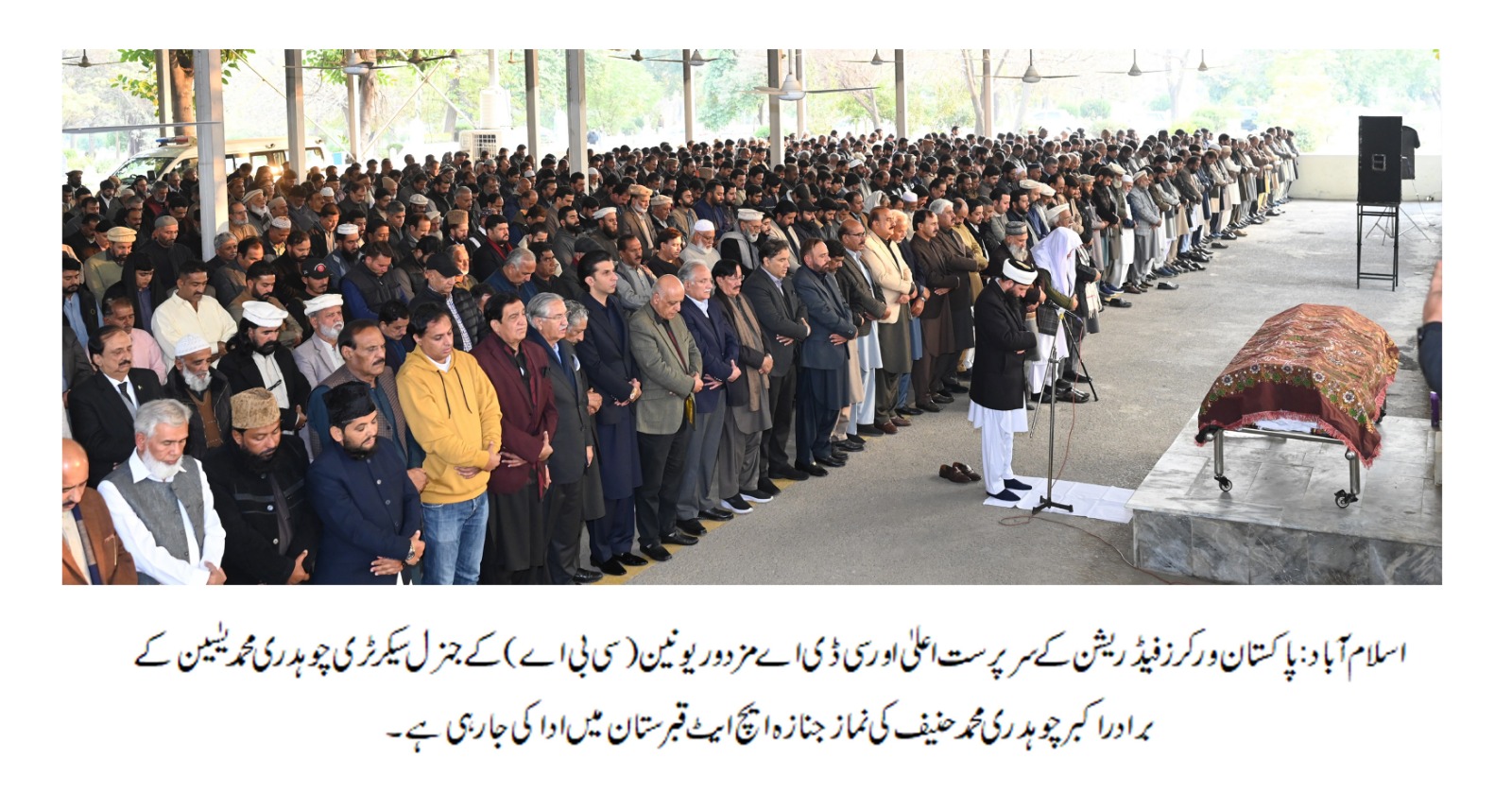 اسلام آباد (ڈیجیٹل پوسٹ) پاکستان ورکرزفیڈریشن کے سرپرست اعلیٰ اور سی ڈی اے مزدور یونین(سی بی اے) کے جنرل سیکرٹری چوہدری محمد یٰسین کے برادراکبرچوہدری محمد حنیف سابق پروڈکشن منیجر ٹاپس مری بروری طویل علالت کے بعد کیپیٹل ہسپتال میں انتقال کر گئے