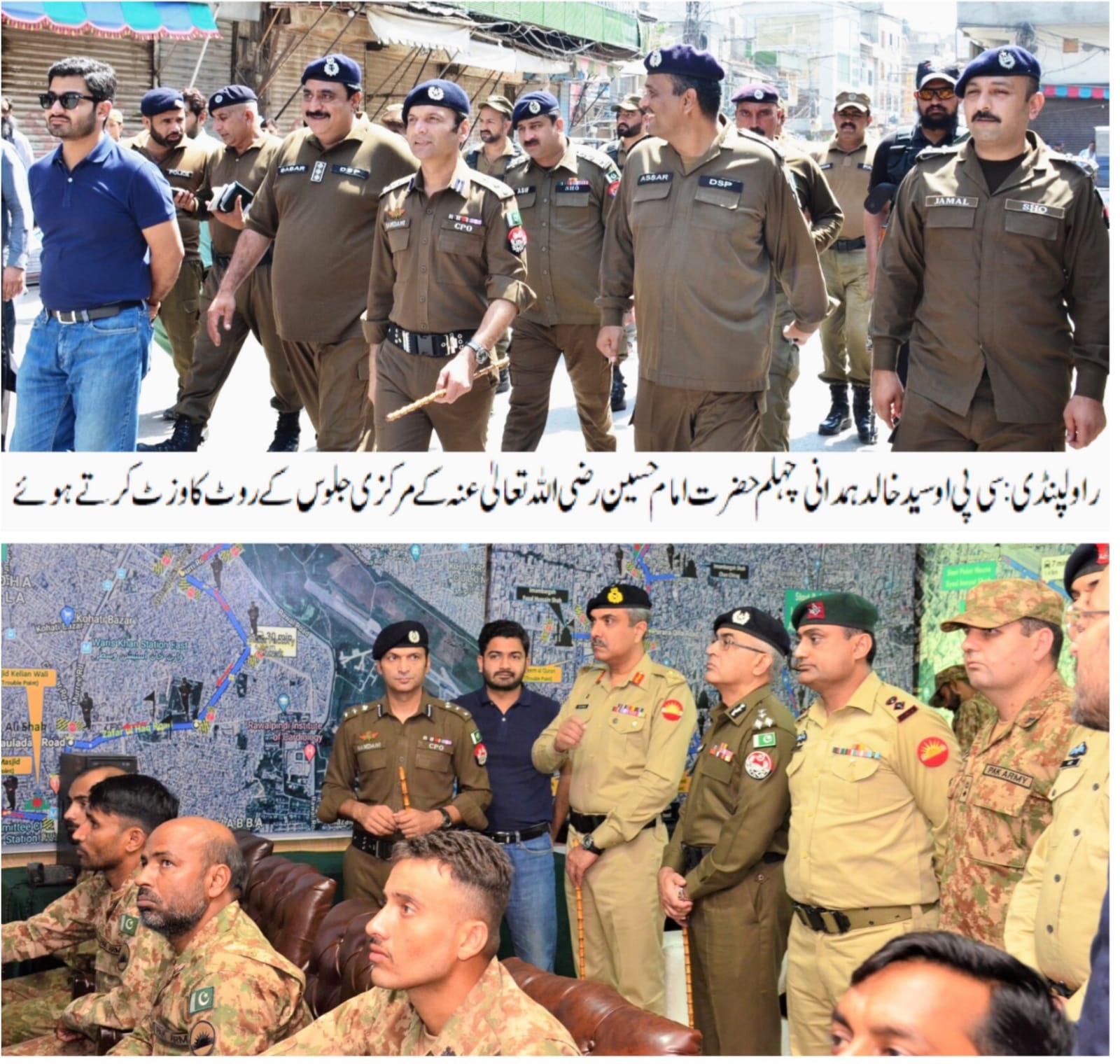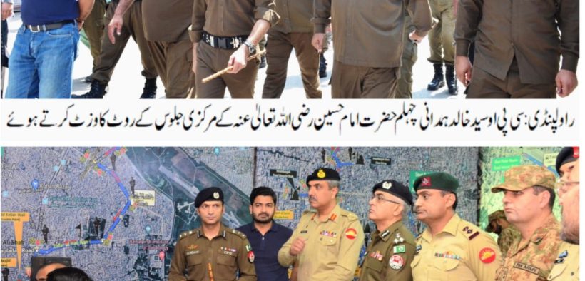 راولپنڈی: آر پی او سید خرم علی، سی پی او سید خالد ہمدانی،ڈپٹی کمشنر حسن وقار چیمہ اور سکیورٹی وقانون نافذ کرنے والے اداروں کے سینئر افسران کے ہمراہ چہلم حضرت امام حسین رضی اللہ تعالیٰ عنہ کے مرکزی جلوس کے روٹ کا وزٹ
