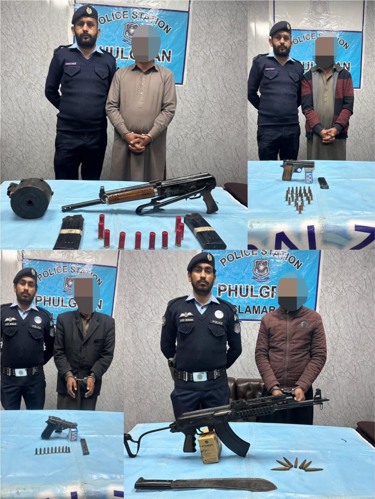 اسلام آباد (ڈیجیٹل پوسٹ) پولیس کی “اسلحہ سے پاک شہر “مہم تیزی سے جاری ہے،اسی سلسلے میں تھا نہ پھلگراں پولیس ٹیم نے چار ملزمان کو گرفتار کرکے ان کے قبضہ سے بھا ری تعداد میں اسلحہ معہ ایمونیشن برآمد کر لیا۔ گرفتار ملزمان کے خلاف مقدمات درج کرکے مزید تفتیش شروع کر دی گئی ہے،ایس ایس پی آپریشنز قاضی علی رضا نے کہا کہ غیر قانونی اسلحے کے خلاف زیرو ٹالرنس پالیسی پر سختی سے عمل کیاجا رہا ہے،شہری اپنے لائسنس یافتہ اسلحے کو فوری طور پر متعلقہ تھانوں میں رجسٹر کرائیں