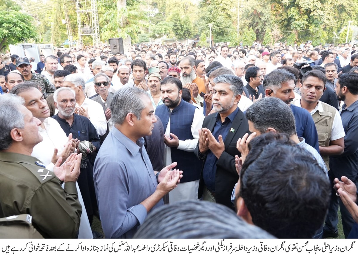 The funeral prayer of Federal Secretary Interior and former Chief Secretary Punjab Abdullah Sumbal was offered at Habib Masjid Tufail Road Cantt today. Caretaker Chief Minister Punjab Mohsin Naqvi and Caretaker Federal Interior Minister Sarfaraz Bugti attended the funeral prayer of Federal Secretary Interior Abdullah Sumbal. Provincial Minister, IG Police, political and social personalities, senior officials and a large number of people attended the funeral prayer. CM Mohsin Naqvi expressed his profound grief and sorrow with the father, son and the bereaved family of Abdullah Sumbal (Late). Mohsin Naqvi expressed his heartfelt sympathy and condolence with the father and son of Abdullah Sumbal (Late). CM Mohsin Naqvi and other personalities prayed for the forgiveness of Abdullah Sumbal (Late). CM Mohsin Naqvi acknowledged that Abdullah Sumbal (Late) was a dutiful and an honest officer adding that the services of Abdullah Sumbal (Late) will be remembered forever.