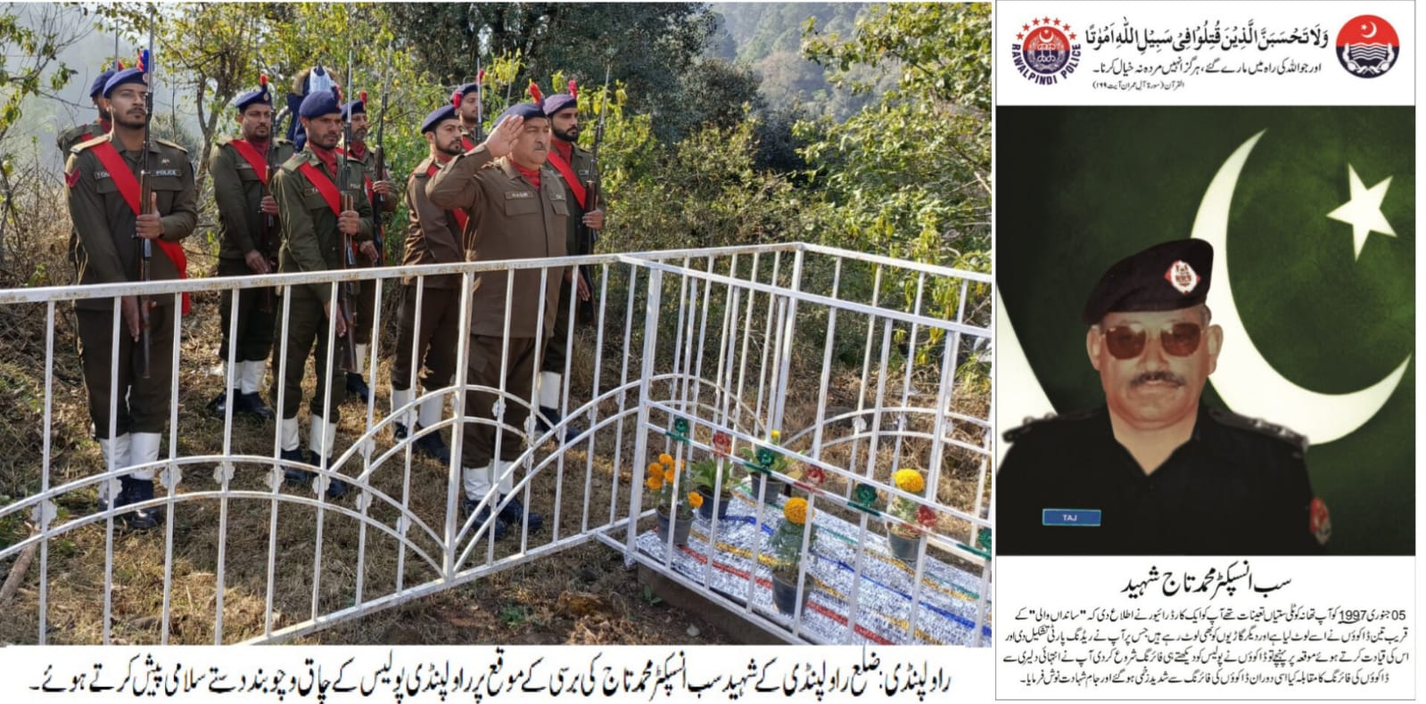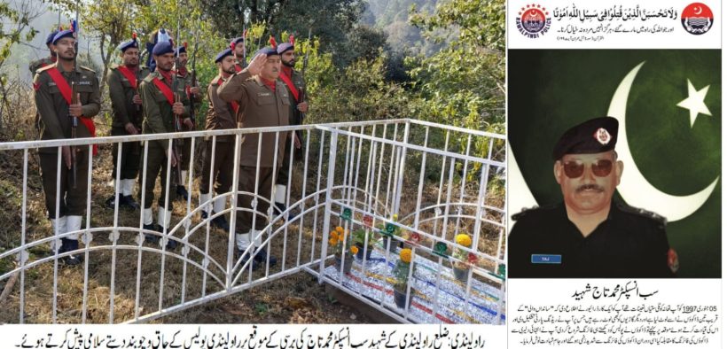 راولپنڈی (ڈیجیٹل پوسٹ) ضلع راولپنڈی کے شہید سب انسپکٹر محمد تاج کی برسی کے موقع پر راولپنڈی پولیس کے چاق و چوبند دستے نے سلامی پیش کی