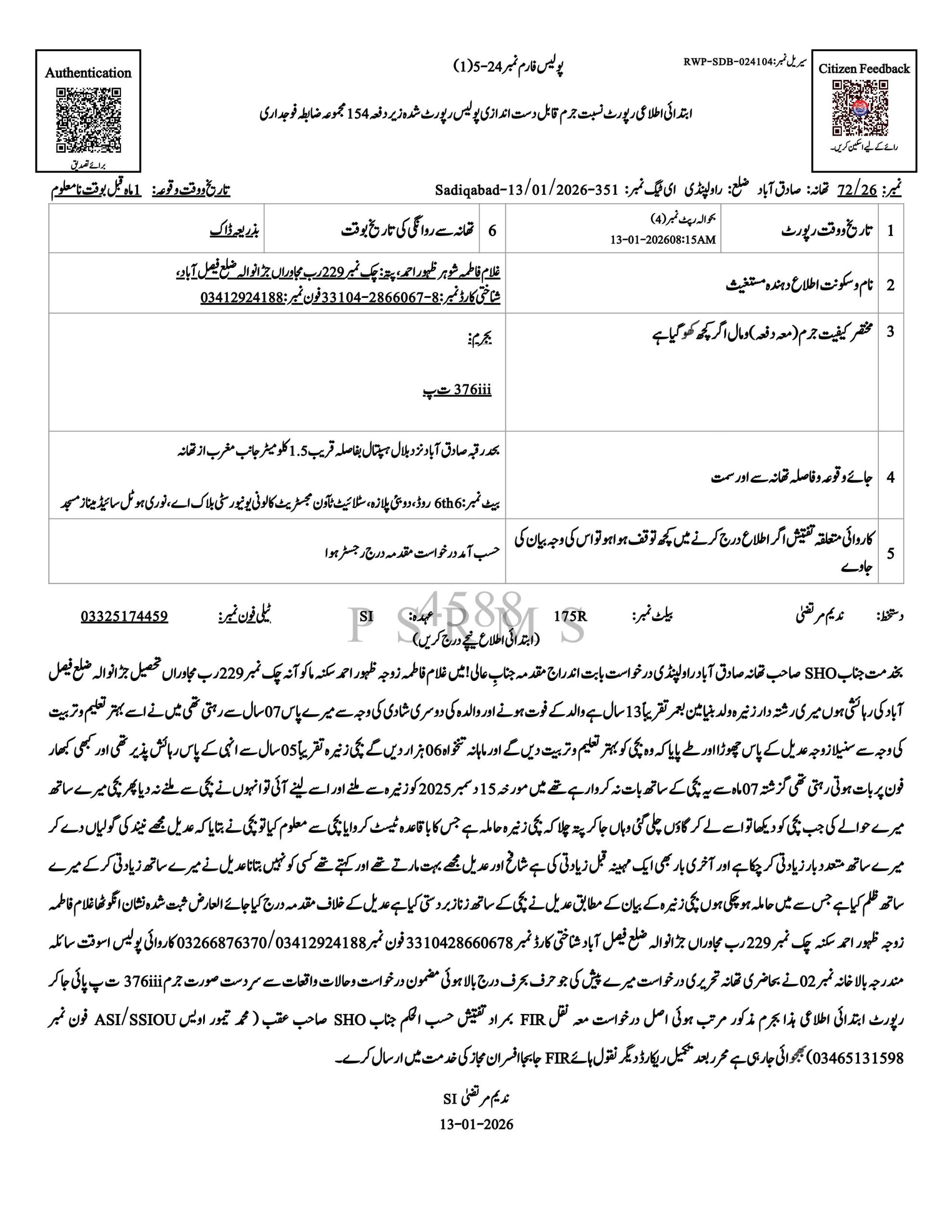 راولپنڈی (ڈیجیٹل پوسٹ) 13سالہ ملازمہ کو نشہ دیکر زبردستی ذیادتی،حاملہ کرنے پر مقدمہ درج