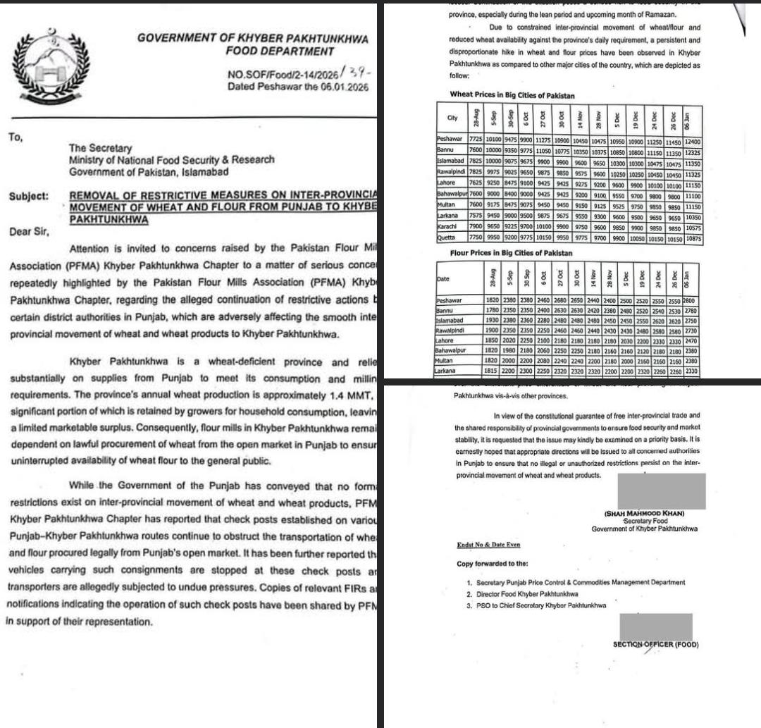 سیکرٹری خوراک حکومتِ خیبر پختونخوا کی جانب سے وزارتِ قومی غذائی تحفظ و تحقیق، حکومتِ پاکستان کو ایک اہم خط ارسال کیا گیا ہے، جس میں پنجاب کی بعض چیک پوسٹس پر گندم اور آٹے کی بین الصوبائی ترسیل میں غیر قانونی رکاوٹوں، ضبطگی اور اختیارات کے ناجائز استعمال کی نشاندہی کی گئی ہے۔