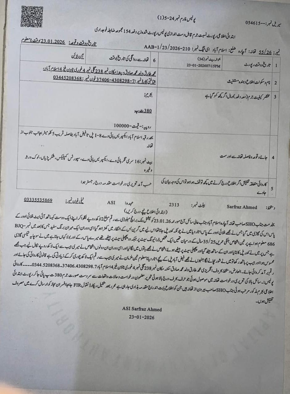 اسلام آباد (ڈیجیٹل پوسٹ) وفاقی دارالحکومت میں امن و امان کی صورتحال ابتر، ایوانِ صدر میں تعینات سی ڈی اے کے سینیئر افسر محمد طارق سے دن دہاڑے ایک لاکھ روپے لوٹ لیے گئے۔ متاثرہ شہری نے پولیس کے رویے اور سست روی پر آئی جی اسلام آباد سے فوری انصاف کی اپیل کر دی۔ تفصیلات کے مطابق، 23 جنوری کو محمد طارق ملوڈی نیشنل بینک سے 2 لاکھ روپے نکلوا کر میٹرو بس کے انتظار میں کھڑے تھے کہ سفید مہران کار سواروں نے “غوری ٹاؤن” چھوڑنے کا جھانسہ دے کر انہیں گاڑی میں بٹھا لیا۔ فیض آباد پہنچنے پر ملزمان نے ان کی جیب سے ایک لاکھ روپے نکال لیے اور مزاحمت پر انہیں چلتی گاڑی سے دھکا دے کر نیچے گرا دیا۔