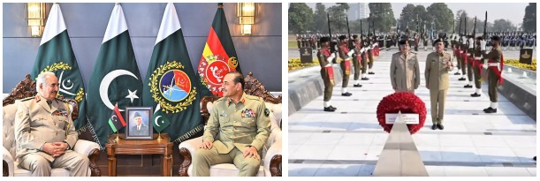 اسلام آباد (ڈیجیٹل پوسٹ)(عباس بیگ مرزا) فیلڈ مارشل عاصم منیر سے کمانڈر اِن چیف لیبین عرب مسلح افواج فیلڈ مارشل خلیفہ ابو القاسم حفتر کی ملاقات ‘ جس میں باہمی دلچسپی بالخصوص متعلقہ خطوں کی سکیورٹی صورتحال پر تبادلہ خیال کیا گیا’ ملاقات میں پیشہ ورانہ تعاون پر پر بھی تبادلہ خیال کیا گیا، پاکستان اور لیبیا کی مسلح افواج کے درمیان مسلسل روابط اور تعاون کی اہمیت پر زور دیا گیا فیلڈ مارشل سید عاصم منیر نے لیبیا کے ساتھ دوطرفہ تعلقات مضبوط بنانے ، لیبیا میں امن، استحکام اور ادارہ جاتی ترقی کے لیے پاکستان کی حمایت کا اعادہ کیا ڈپٹی کمانڈر اِن چیف لیبین عرب مسلح افواج لیفٹیننٹ جنرل صدام خلیفہ حفتر بھی ہمراہ تھے’ نور خان ائیر بیس آمد پر فیلڈ مارشل خلیفہ ابو القاسم حفتر کا استقبال کیا گیا، فیلڈ مارشل سید عاصم منیر نے کمانڈر اِن چیف لیبین عرب مسلح افواج کا استقبال کیا جبکہ معزز مہمان نے شہدا کو خراجِ عقیدت پیش کیا اور جی ایچ کیو میں یادگارِ شہدا پر پھول رکھے