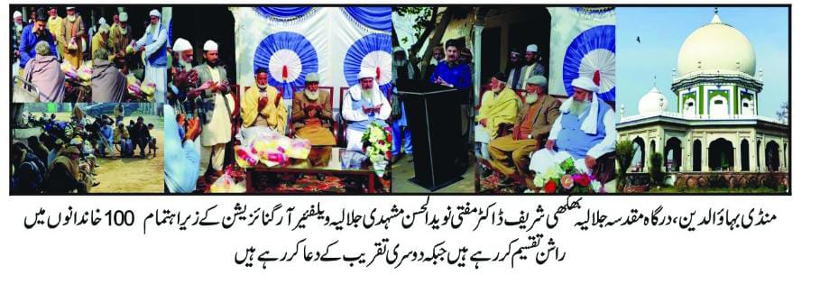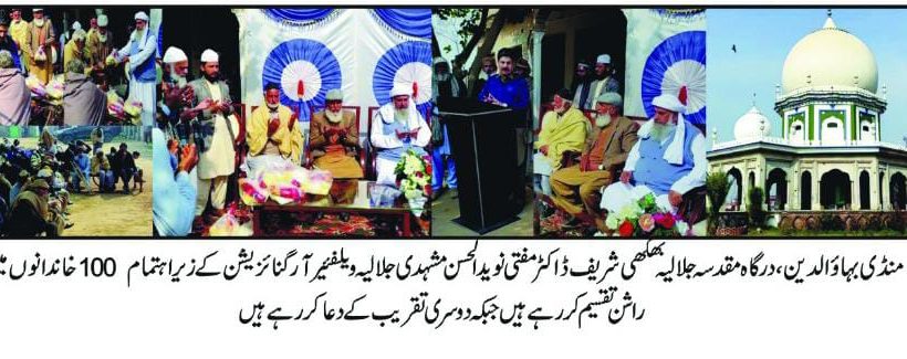 اسلام آباد (ڈیجیٹل پوسٹ) درگاہ مقدسہ جلالیہ بھکھی شریف خدمت خلق کا بہترین پلیٹ فارم ہے۔اسسٹنٹ کمشنر اسفند یار اس تقریب کا مقصد فقراء،غربا اور یتیم بچے اور بیواؤں کو شب برات کی خوشیوں میں شریک کرنا ہے۔ڈاکٹر مفتی نوید الحسن مشہدی جلالیہ ویلفئیر آرگنائزیشن کے زیر اہتمام 100 خاندانوں میں راشن تقسیم کر دیا گیا جلالیہ ویلفئیر آرگنائزیشن کے زیر اہتمام شب برات (عید)کے موقع پر ہر سال کی طرح اس سال بھی 100 خاندانوں میں راشن تقسیم کر دیا گیا۔تقریب کا اہتمام درگاہ مقدسہ جلالیہ بھکھی شریف پر کیا گیا۔تفصیلات کے مطابق ان خیالات کا اظہار درگاہ مقدسہ جلالیہ بھکھی شریف کے سجادہ نشین شیخ الحدیث الحاج ڈاکٹر مفتی پیر سید محمد نوید الحسن شاہ صاحب مشہدی سرپرست اعلی جماعت جلالیہ پاکستان نے کرتے ہوئے فرمایا کہ یہ درگاہ وہ ہے جہاں پر خدمت خلق کو اولین فریضہ سمجھا جاتا ہے ۔یہ خدمت خلق کا سلسلہ مشائخ عظام بھکھی شریف سے چلا آ رہا ہے جس میں دن بدن بہاریں ہی بہاریں ہیں۔کوئی بھی موقع ہو چاہے سیلاب سے متاثرہ علاقے ہوں چاہے زلزلہ سے متاثرہ علاقے ہوں چاہے کرونا جیسی وبا میں افراد گھرے ہوئے ہوں جو بھی موقع ہو یہ درگاہ صف اول میں ہو کر خدمت خلق کا فریضہ سر انجام دیتے ہوئے نظر آتی ہے۔خدمت خلق سے ہی انسان کو قرب الہی میسر ہوتا ہے ۔شب برات کے موقع پر لوگ گھروں میں کھانے میں میٹھا شامل کرتے ہیں اس لئے ان بے سہارا فقرا غربا مساکین یتیم بچے اور بیواؤں میں راشن تقسیم کیا گیا تاکہ یہ لوگ بھی آسانی سے اپنے کھانے میں یہ چیزیں شامل کر سکیں ۔تقریب کے مہمان خصوصی لیفٹیننٹ ریٹائرڈ اسفند یار صاحب اسسٹنٹ کمشنر منڈی بہاؤالدین اور عزت مآب محمد ارشد صاحب اسسٹنٹ ڈائریکٹر سوشل ویلفیئر منڈی بہاؤالدین تھے ۔اسسٹنٹ کمشنر اسفند یار نے کہا کہ یہ درگاہ مقدسہ وہ ہے جہاں سے آج بھی صوفیاء کرام کی تعلیمات سے معاشرہ کو روشناس کروایا جاتا ہے اور یہ درگاہ خدمت خلق کا بہترین پلیٹ فارم ہے۔100 خاندانوں میں راشن تقسیم کرنا یہ ایک مستحسن عمل ہے جس پر درگاہ شریف کے سجادہ نشین ڈاکٹر مفتی پیر سید محمد نوید الحسن شاہ مشہدی کو خراج تحسین پیش کیا جاتا ہے ۔تقریب کے اختتام پر قبلہ مرشد گرامی شیخ الحدیث الحاج مفتی ڈاکٹر پیر سید محمد نوید الحسن شاہ صاحب مشہدی سجادہ نشین آستانہ عالیہ بھکھی شریف نے دعائے خیر فرمائی ۔