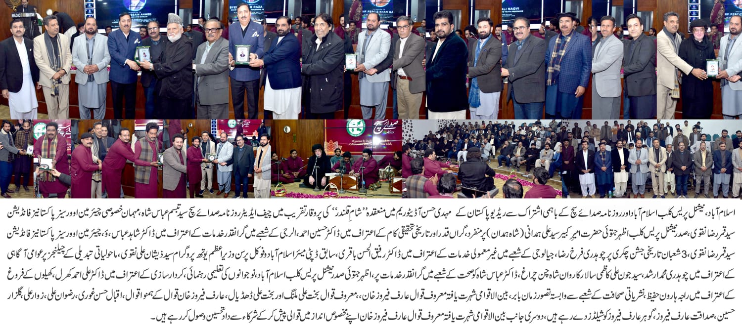 اسلام آباد (ڈیجیٹل پوسٹ) اووسیز پاکستانیز فائونڈیشن کے چیئرمین سید قمر رضا نقوی نے کہا ہے کہ حضرت لال شہباز قلندر نے عشق ،رواداری اور خدمت خلق کا درس دیا ہے۔ ہم اگر اولیاء کی تعلیمات کو عملی زندگی کا حصہ بنا لیں تو معاشرے سے آدھے مسائل ختم ہو جائیں گے۔ ان خیالات کا اظہار انہوں نے نیشنل پریس کلب اور روزنامہ صدائے سچ کے اشتراک سے ریڈیو پاکستان کے مہدی حسن آڈیٹوریم میں منعقد ہ “شام قلندر”کے اختتام پرملک بھر سے مختلف شعبہ ہائے زندگی میں نمایاں کارکردگی کے حامل افراد میں ایوارڈز اور اعزازات تقسیم کرنے کی تقریب سے خطاب میں کیا۔ قبل ازیں قوالی کا آغاز جواد علی ملنگ اور بخت علی ڈھڈیال نے کیا جسے پاکستان کے معروف قوال عارف فیروز خان نے اپنے مخصوص انداز میںقوالی سے بام عروج تک پہنچا تے ہوئے محفل کو روحانی سوز و گداز سے بھر دیا۔ ان کے کلام سے متاثر ہو کر حاضرین کی بڑی تعداد آبدیدہ ہوگئی۔مہمان خصوصی چیئرمین او پی ایف نے کہاکہ عارف فیروز خان قوال جیسی شخصیات ہمارا قومی فخر ہیںجنہوں نے دلوں میں اسلام کی روشنی پھیلائی اور کئی غیر مسلموں کو اسلام سے روشناس کروایاجبکہ تقریب میں موجود مختلف شعبہ ہائے زندگی میں پوری دنیا میں کامیابی کے جھنڈے گاڑنے والی شخصیات کو دیئے جانے والے ایوارڈز محض اعزاز نہیں ہیں بلکہ پوری قوم کے مشعل راہ ہیں جو ہمیں یاد دلاتے ہیں کہ خدمت اور لگن ہی حقیقی کامیابی ہے۔ چیف ایڈیٹر روزنامہ صدائے سچ، سید تبسم عباس شاہ اور صدر نیشنل پریس کلب، اظہر جتوئی نے تمام شرکا کو خوش آمدید کہا۔ تقریب میں مختلف شعبہ ہائے زندگی سے تعلق رکھنے والی نمایاں شخصیات اور ماہرین نے شرکت کی۔محفل کے مہمانانِ خصوصی میں چیئرمین اوورسیز پاکستانیز فائونڈیشن سید قمر رضا نقوی، وزیراعظم کے فوکل پرسن برائے یوتھ پروگرام سید ذیشان علی نقوی شامل تھے ۔ ایوارڈز کے موقع پر مختلف شعبہ ہائے زندگی میں نمایاں خدمات انجام دینے والی شخصیات کو اعزازات سے نوازا گیا جن میں عارف فیروز خان قوال کو اسلام کا حقیقی پیغام غیرمسلموں تک پہنچا کر انہیں مشرف بہ اسلام کرنے پر “سفیر مودت”کے اعزاز سے نوازا گیا، سو سے زیادہ کتابوں کے مصنف، آئل اینڈ گیس کی متعدد ذخائر دریافت کرنیوالے ماہر جیالوجسٹ ڈاکٹر رفیق الحسن باقری،کشمیر ، گلگت اور وسطی ایشیائی ریاستوں کے لاکھوں افراد کو دائرہ اسلام میں داخل کرنیوالی شخصیت حضرت امیر کبیر سید علی ہمدانی شاہ ہمدان ہر نمل یونیورسٹی سے پی ایچ ڈی کرنیوالے ریسرچ سکالر ڈاکٹر حسین احمد،دنیا بھر میں الرجی پر تحقیق ، جدید ترین ویکسین اور ادویات ایجاد کرنے کی بدولت پاکستان کا نام روشن کرنے والے ڈاکٹر شاہد عباس،وفاقی دارالحکومت میں معیار تعلیم اور سرکاری تعلیمی اداروں کے نتائج کو بہترین کرنے والے ماہر تعلیم ڈاکٹر علی احمد کھرل(سابق ڈائریکٹر جنرل وفاقی نظامت تعلیم )،پاکستان اورپاکستان سے باہرماحولیاتی تبدیلیوں کے حوالے سے آگاہی کا فریضہ ادا کرنیوالے لکھاری چوہدری محمد ارشد،پاکستان اور بیرون ملک میں سپورٹس کے شعبے میں گراں قدر خدمات پر راجہ ہارون حفیظ، نواسہ رسول کی ولادت کے حوالے سے پاکستان کی سب سے بڑی تقریب منعقد کرنیوالی کاروباری شخصیت چوہدری فرخ رضا کو اعزازات سے نوازا گیا جبکہ برطانیہ میں ہزاروں مریضوں کا کامیابی سے علاج کرنے اور بیرون ملک سے علاج کیلئے پاکستان راغب کرنیوالے ڈاکٹر عباس شاہ کو ہیلتھ ایمبیسڈر، نوجوانوں میں ذکر امام حسین اور فکر امام حسین کے فروغ پرکاروان شاہ چن چراغ کے سالار سید جون علی کاظمی کو “سالارپاکستان”،بلا تفریق سیاسی وابستگی نوجوانوں کی ترقی کیلئے ہمہ وقت کوشاں وزیر اعظم کے فوکل پرسن برائے یوتھ پروگرام سیدذیشان علی نقوی کو “یوتھ ایمبیسڈر”،پاکستان میں اوورسیز پاکستانیوں اور دنیا بھر میں پاکستان کا امیج بہتر بنانے کیلئے قابل قدر خدمات پر چیئرمین او پی ایف سید قمر رضا نقوی کو “اوورسیز ایمبیسیڈر “جبکہ جواد علی ملنگ اور بخت علی ڈھڈیال کو “ینگ سنگر”ایوارڈ سے نواز