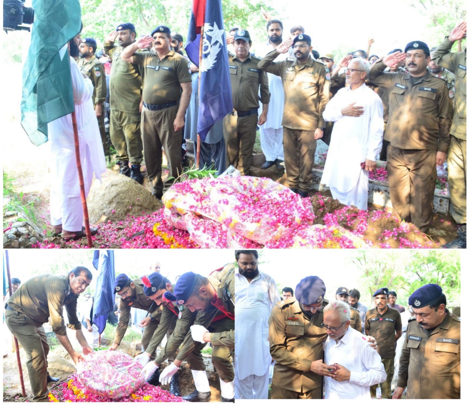 ایس پی پوٹھوہار محمد وقاص خان،ایس پی صدر محمد نبیل کھوکھرسمیت دیگر افسران نے شہید کی لحد پرحاضری دی،پولیس کے چاق وچوبند دستے نے شہید کو سلامی پیش کی، ایس پی پوٹھوہار محمد وقاص خان اور ایس پی صدمحمد نبیل کھوکھر نے شہید کی لحد پر پھول چڑھائے اور درجات کی بلندی کے لئے دعا کی گئی،سینئر افسران نے شہید کانسٹیبل کے لواحقین سے ملاقات کی،کانسٹیبل عدیل ظفر گزشتہ رات بحریہ ٹاؤن روات کے علاقہ میں ڈاکؤوں کی فائرنگ سے شہید ہوئے تھے، واقعہ میں کانسٹیبل عاشر اور عادل بھی زخمی ہوئے جن کا علاج معالجہ جاری ہے، فائرنگ کے تبادلے میں تین ڈاکو بھی ہلاک ہوئے، سی پی اوسید خالدہمدانی کا کہناتھاکہ شہید کانسٹیبل عدیل ظفر نے خطرناک ڈاکؤوں سے لڑتے ہوئے اپنی جان قربان کی، راولپنڈی پولیس کے 116 افسران فرض کی راہ میں اپنی جانوں کا عظیم نذرانہ پیش کر چکے ہیں، دکھ کی اس گھڑی میں شہید کے اہل خانہ کے ساتھ کھڑے ہیں، شہداء اور غازیوں نے شہریوں کے جان و مال کی حفاظت کے دوران فرض کی راہ میں لازوال قربانیاں دی ہیں۔