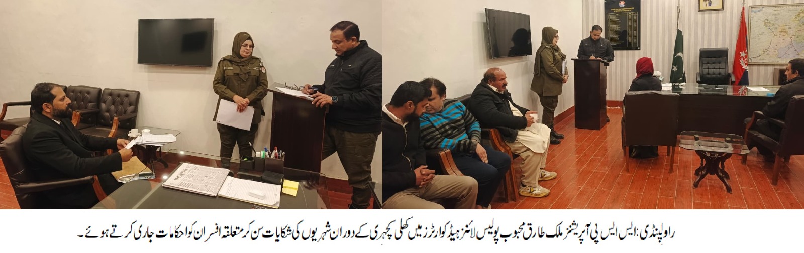 راولپنڈی (ڈیجیٹل پوسٹ) ایس ایس پی آپریشنز ملک طارق محبوب کی پولیس لائنز ہیڈ کوارٹر میں کھلی کچہری ایس ایس پی اپریشنز نے شہریوں کی شکایات سن کر ان کے حل کے لیے متعلقہ افسران کو احکامات جاری کیے مار کردہ درخواستوں پہ دیے گئے ٹائم فریم کے اندر قانونی کاروائی کو یقینی بنایا جائے ایس ایس پی اپریشنز کی متعلقہ افسران کو ہدایت،شہریوں کے مسائل کے فوری حل میں کسی قسم کی غفلت برداشت نہیں کی جائے گی ایس ایس پی آپریشن نے شہریوں کی شکایت سن کر ان کے حل کے لیے متعلقہ افسران کو احکامات جاری کیے تھانوں میں شہریوں کے لیے بہترین سروس ڈلیوری کو ہمہ وقت یقینی بنایا جائے