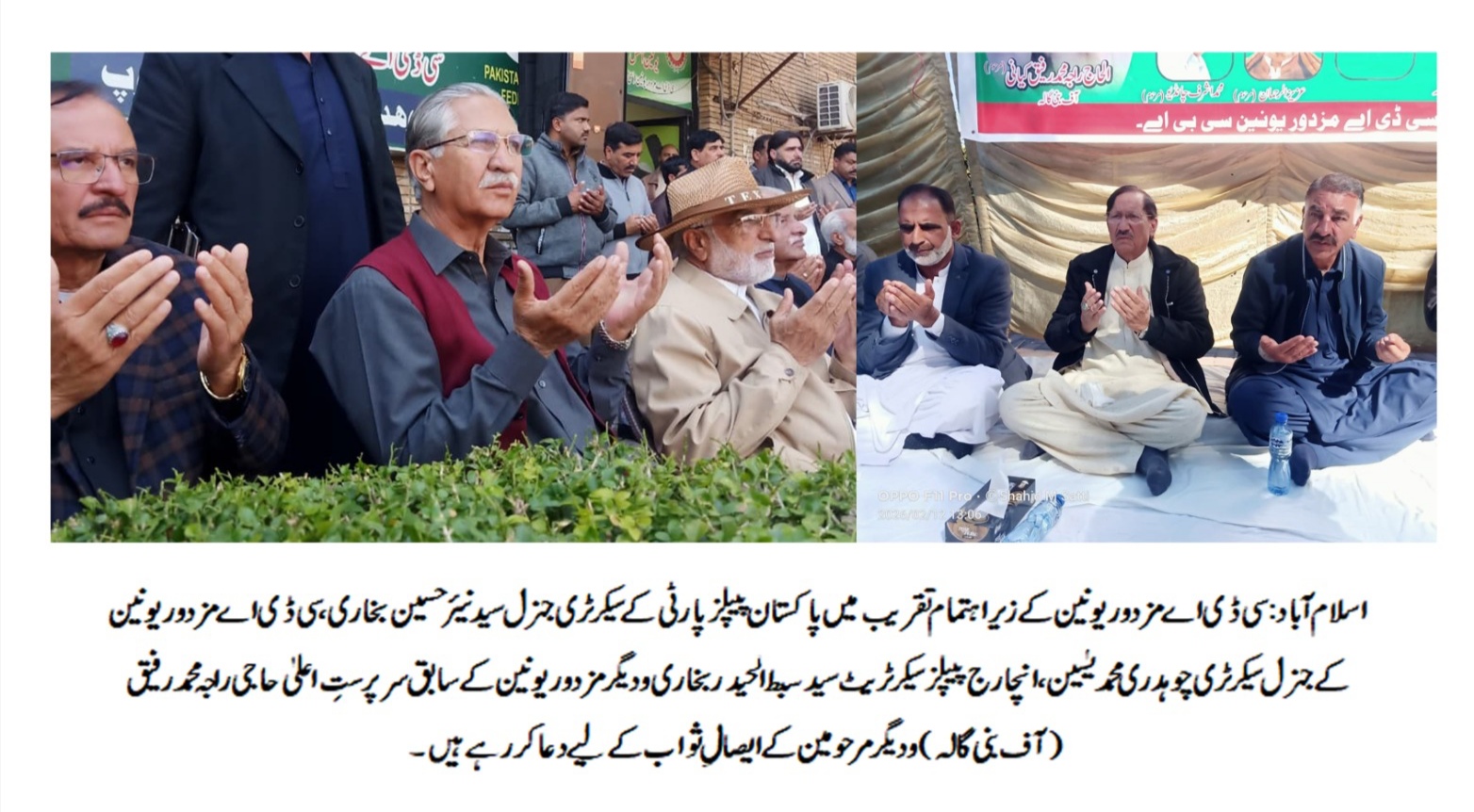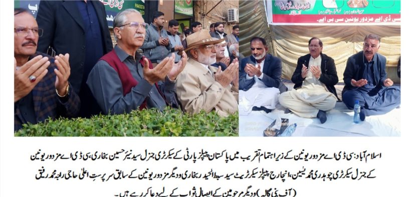 اسلام آباد (ڈیجیٹل پوسٹ) راجہ محمد رفیق کیانی مرحوم کی زندگی سی ڈی اے ملازمین کی فلاح و بہبود اور ادارے کی ترقی کے لیے وقف تھی۔ سید نیئر حسین بخاری الحاج راجہ محمد رفیق کیانی کی مزدوروں کے لیے خدمات ناقابل فراموش ہیں۔ چوہدری محمد یٰسین سی ڈی اے مزدور یونین کے سابق سرپرست اعلیٰ حاجی محمد رفیق و دیگرکی ارواح کے ایصال ثواب کے لیے دعائیہ تقریب کا اہتمام۔ تقریب میں پاکستان پیپلز پارٹی کے سیکرٹری جنرل سید نیئر حسین بخاری، انچارج پیپلز سیکرٹریٹ سید سبط الحیدر بخاری و دیگر کی شرکت۔ سی ڈی اے مزدور یونین کے زیر اہتمام تنظیم کے سابق سرپرستِ اعلیٰ حاجی راجہ محمد رفیق (آف بنی گالہ)، محمد اشرف چانڈیو، عزیزالرحمان، ریاض عباسی اور اشفاق گجر کی والدہ مرحومہ کی ارواح کے ایصالِ ثواب کے لیے ایک پُروقار دعائیہ تقریب مرکزی چیئرمین آفس، سیکٹر جی سیون فور میں زیرِ صدارت پیر قاری عبید احمد عبید نقشبندی منعقد ہوئی۔تقریب میں پاکستان پیپلز پارٹی کے سیکرٹری جنرل سید نیئر حسین بخاری، انچارج پیپلز سیکرٹریٹ سید سبط الحیدر بخاری، مولانا عبدالغنی نقشبندی، قاری املاک چشتی، حافظ محمد اکرم چشتی، سی ڈی اے مزدور یونین کے جنرل سیکرٹری چوہدری محمد یٰسین، صدر اورنگزیب خان، چیئرمین راجہ شاکر زمان کیانی، سپریم ہیڈ مرزا سعید اختر، حاجی صابر، اظہار عباسی، واجد گجر، چوہدری ابرار، صفدر عباسی، چوہدری شہزاد اختر، سردار محمد آصف، اظہر تنولی، سردار نسیم ممتاز، سید مقبول شاہ، اسد محمود، محمد سرفراز ملک، کلیم عباسی، چوہدری طارق گجر، شفیع اللہ خان، راجہ ہمایوں سلطان، راجہ اشتیاق کیانی، راجہ کبیر کیانی، محبوب عزیزالرحمان، ارشاد گجر، سردار خان نیازی، چوہدری انور، سلطان بہادر، ذوالقرنین ججہ، ناصر عباسی، چوہدری صغیر، ندیم ستی، ملک رحمان، راجہ رئیس، راجہ ایاز، شیراز خان، راجہ غلام مرتضیٰ، طارق آفریدی، واجد محمود، زاہد بھٹی، سردار شوکت، چوہدری عجائب، سردار اخلاق، نعمان کیانی، سید ارشاد شاہ، سردار جاوید، ملک محمد اسلم، ملک اکمل شہزاد،شاہد محمودستی،گوہرالہیٰ،شاہد گجر،غلام نبی بلتی،بلال اعوان سمیت دیگر مرکزی عہدیداران، سوشل میڈیا ممبران، سی ڈی اے ملازمین اور سیاسی، سماجی و مذہبی حلقوں سے تعلق رکھنے والے افراد نے کثیر تعداد میں شرکت کی۔تقریب میں آستانہ الخیریہ کے محمد سعید الخیری کی قیادت میں طلباء نے قرآن خوانی کی جبکہ ثناء خوانانِ مصطفیؐ قاری شہزاد احمد مدنی، قاری احمد نواز قادری، چوہدری نیاز نقشبندی، ناصر سلطانی، رشید احمد نون، عباس علی اشرف اور محمد زاہد قادری نے گلہائے عقیدت پیش کیے۔ دعائیہ کلمات کے ذریعے مرحومین کے درجات کی بلندی اور مغفرت کے لیے خصوصی دعا کی گئی۔اس موقع پر خطاب کرتے ہوئے پاکستان پیپلز پارٹی کے سیکرٹری جنرل سید نیئر حسین بخاری نے کہا کہ راجہ محمد رفیق کیانی مرحوم کی زندگی سی ڈی اے ملازمین کی فلاح و بہبود اور ادارے کی ترقی کے لیے وقف تھی۔ انہوں نے کہا کہ مرحوم کے نقشِ قدم پر چلنا ہی ان کے لیے بہترین خراجِ عقیدت ہے اور ان کے صاحبزادگان پر لازم ہے کہ وہ اپنے والد کی خدمات کو مشعلِ راہ بنائیں۔سی ڈی اے مزدور یونین کے جنرل سیکرٹری چوہدری محمد یٰسین نے اپنے خطاب میں کہا کہ انسان کا کوئی نعم البدل نہیں ہوتا اور مخلص و محنتی ساتھیوں کی کمی کبھی پوری نہیں کی جا سکتی۔ انہوں نے کہا کہ مرحومین سی ڈی اے مزدور یونین اور مزدوروں کے حقوق کی جدوجہد میں ہمیشہ صفِ اول میں رہے اور ان کی خدمات اور قربانیوں کو ہمیشہ سنہری حروف میں یاد رکھا جائے گا۔تقریب کے اختتام پر مرحومین کے درجات کی بلندی، پسماندگان کے لیے صبرِ جمیل، ادارے کی ترقی اور ملک کی خوشحالی کے لیے خصوصی دعا کی گئی۔