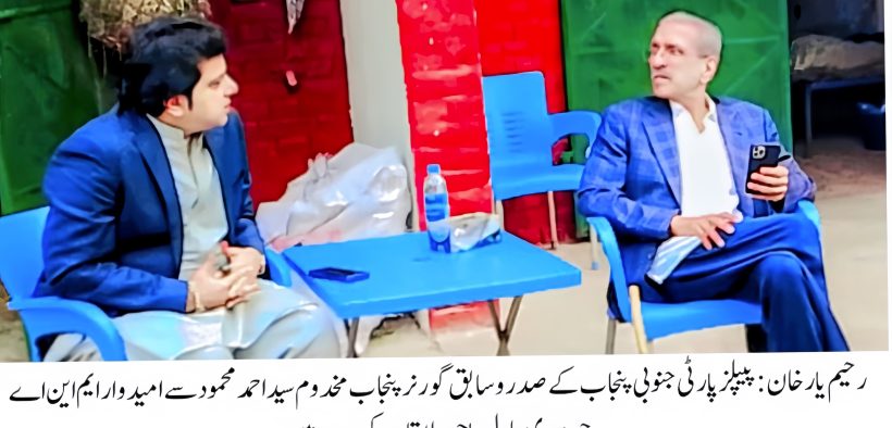 رحیم یارخان:پیپلزپارٹی جنوبی پنجاب کے صدروسابق گورنرپنجاب مخدوم سید احمد محمود سےپارٹی کے حلقہ این اے 172سے امیدوارایم این اے چوہدری عادل باجوہ ملاقات کررہے ہیں