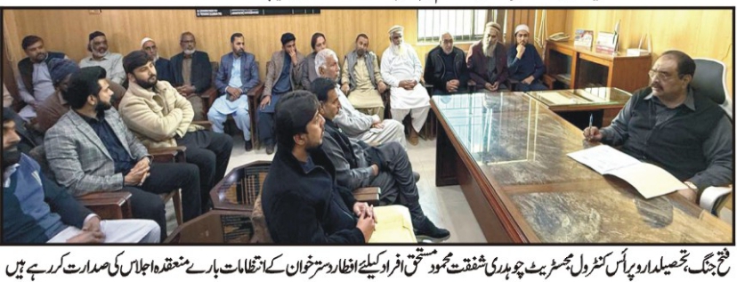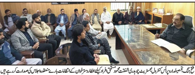 فتح جنگ (ڈیجیٹل پوسٹ) تحصیلدار فتح جنگ چوہدری شفقت محمود کی زیر صدارت رمضان المبارک کے دوران مستحق افراد کے لیے افطار دسترخوان کے انتظامات کے حوالے سے ایک اہم اجلاس منعقد ہوا۔