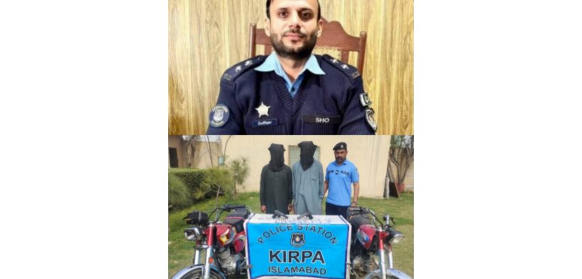 تفصیلات کے مطابق ایس پی سوان زون خرم اشرف کی خصوصی ہدایات پر ایس ایچ او تھانہ کرپا ذوالفقار علی کی سربراهی میں محمد اختر اے ایس آئی نے ہمراہ ٹیم دو ملزمان کو گرفتار کر کے ملزمان کے قبضے سے چھینی گئی موٹر سائیکل ہنڈا 125سمیت چوری شدہ موٹر سائیکل برآمد کر لی گئی۔ مزید تفتیش پر پولیس ٹیم نے واردات میں استعمال ہونے والا پسٹل بھی برآمد کر لیا