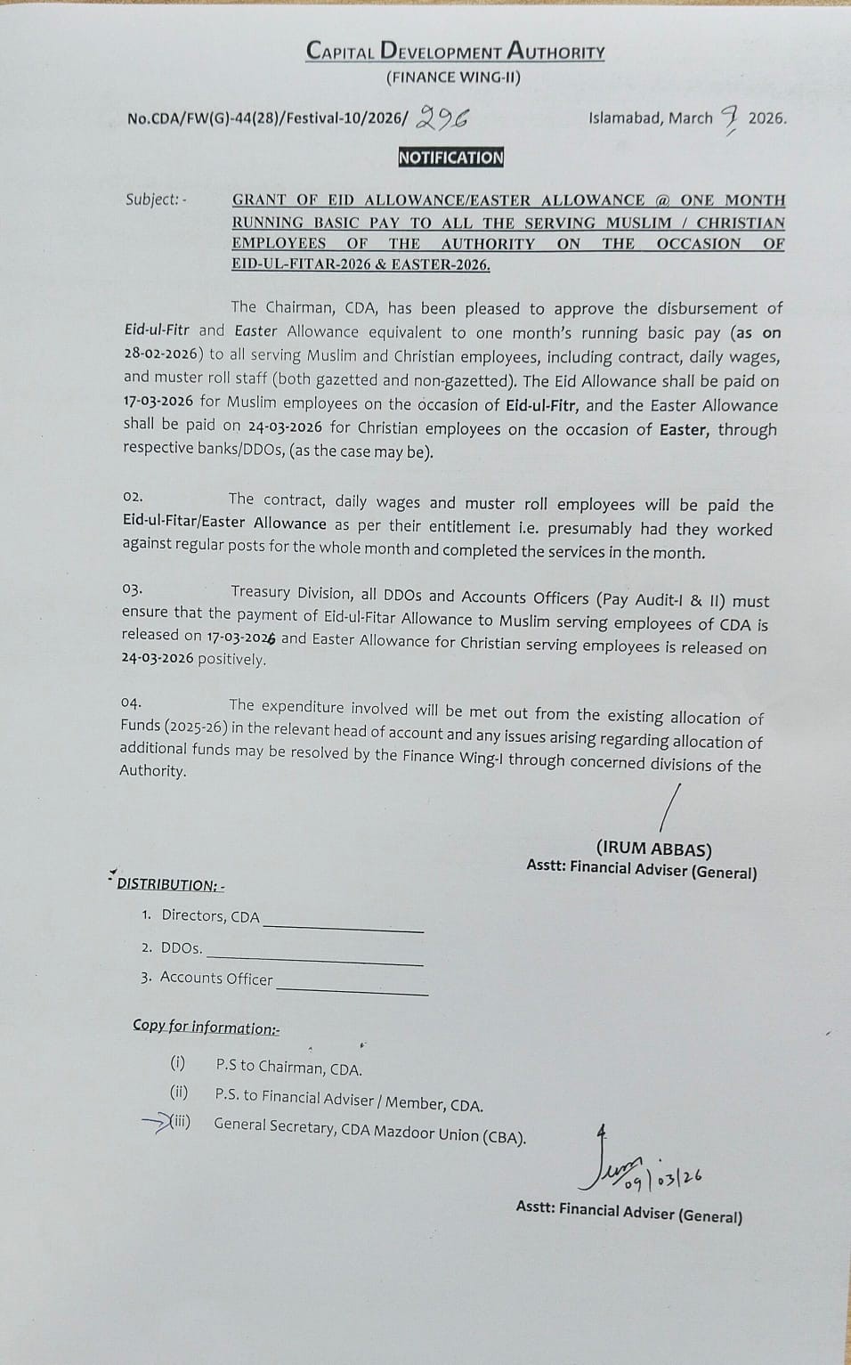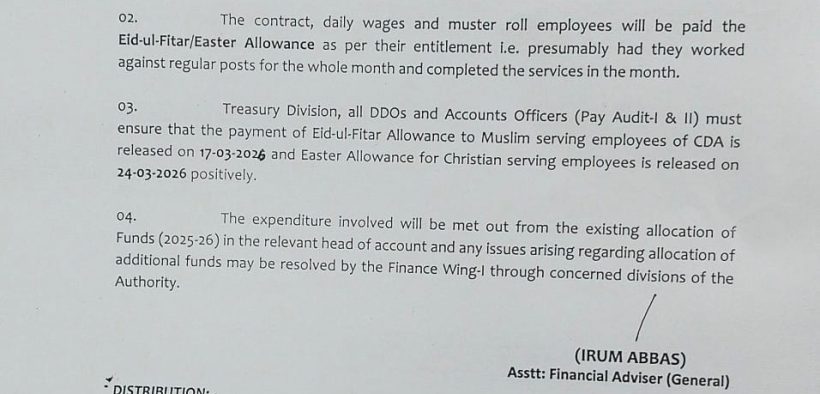 اسلام آباد (ڈیجیٹل پوسٹ) سی ڈی اے مزدور یونین (سی بی اے) کے ساتھ طے شدہ معاہدے کے تحت سی ڈی اے انتظامیہ نے تمام مسلم ملازمین اور افسران کے لیے ایک بنیادی تنخواہ بطور عید بونس الاؤنس اور تمام مسیحی ملازمین کے لیے ایک بنیادی تنخواہ بطور ایسٹر الاؤنس کی منظوری دے دی