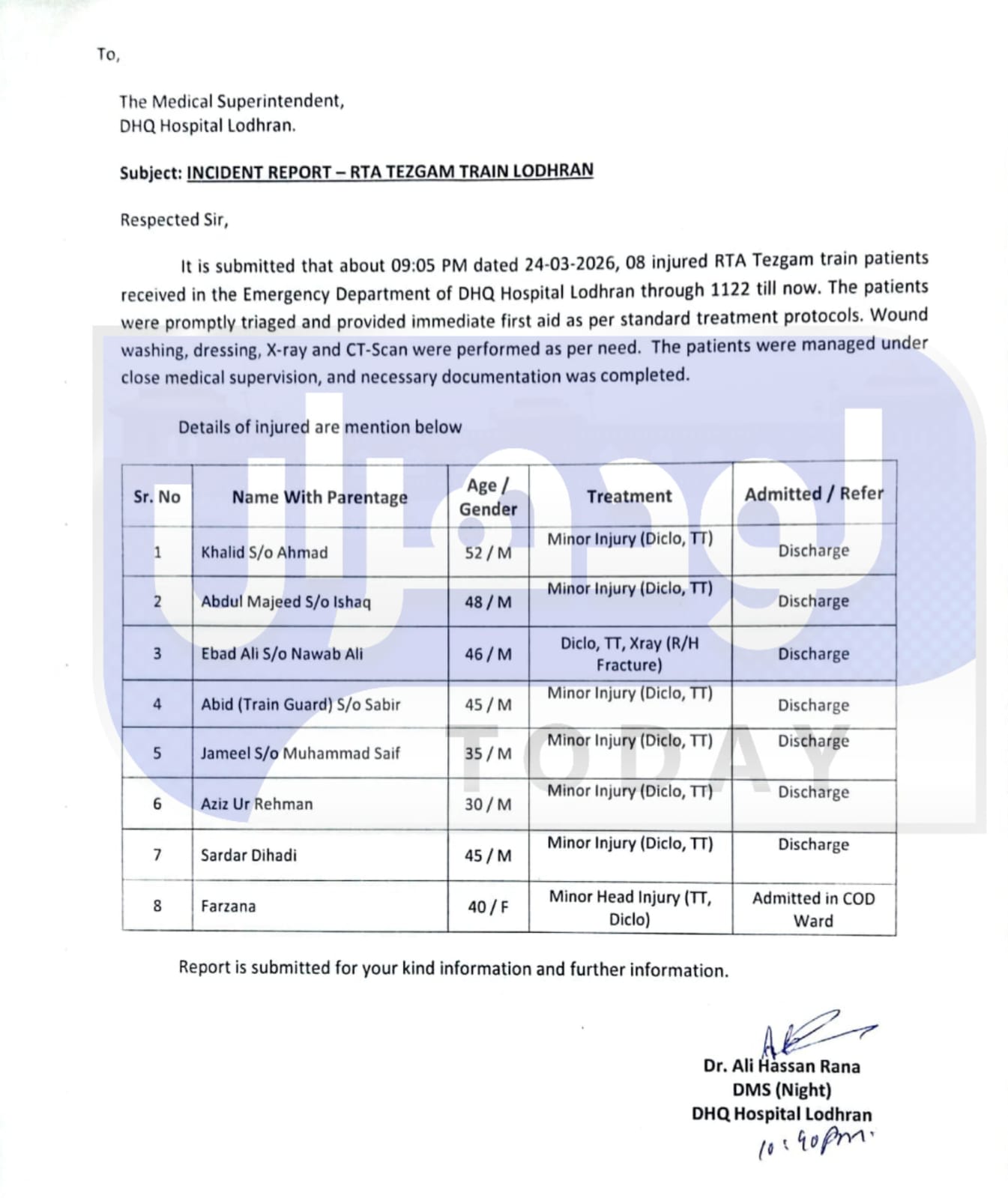 لودھراں (ڈیجیٹل پوسٹ) آدم واہن کے قریب تیز گام ایکسپریس حادثے کا شکار
