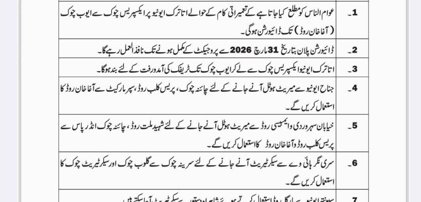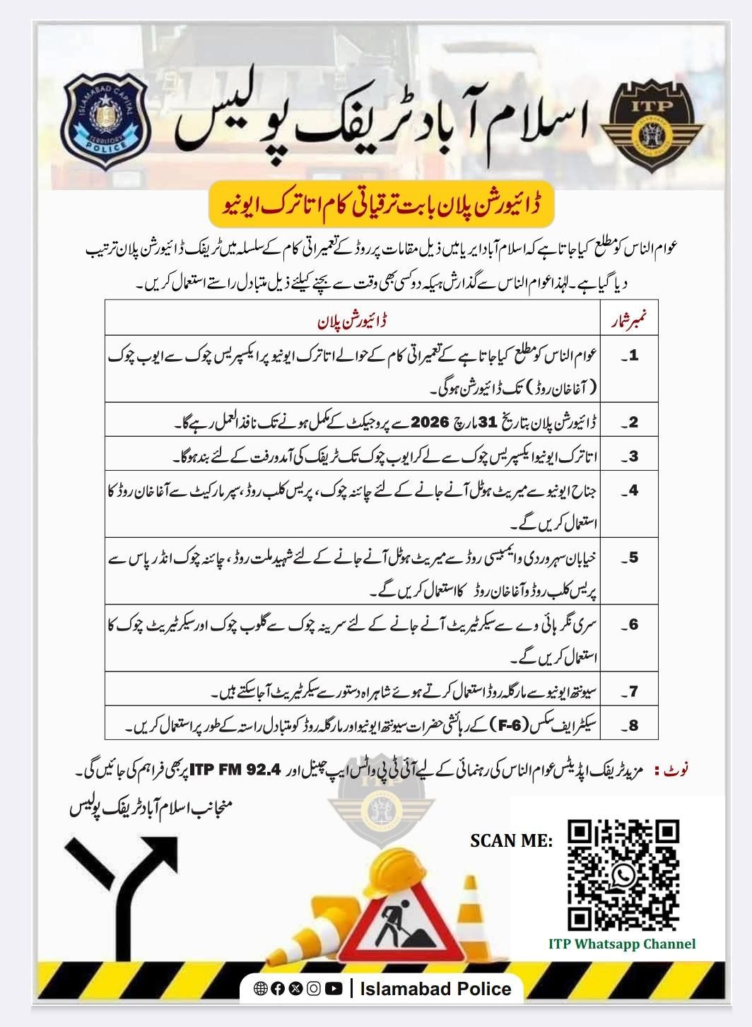 اسلام آباد (ڈیجیٹل پوسٹ) اسلام آباد ٹریفک پولیس نے وفاقی دارلحکومت میں تعمیراتی کام کے حوالے سے ڈائیورشنز پلان جاری کر دیا۔شہریوں کی سہولت کے لئے متبادل راستوں کا انتظام کیا گیا ہے۔تمام افسران شہر میں ٹریفک کی روانی کی برقرار رکھنے کے ساتھ شہریوں کو متاباد ل راستوں کے متعلق آگاہی فراہم کریں۔تفصیلات کے مطابق اسلام آباد ٹریفک پولیس نے وفاقی دارلحکومت میں تعمیراتی کام کے حوالے سے ڈائیورشنز پلان جاری کر دیا۔یہ ڈائیورشن پلان بتاریخ 31 مارچ 2026 سے پروجیکٹ کے مکمل ہونے تک نافذالعمل رہے گا۔شہریوںکی سہولت کے لئے متبادل راستوں کا انتظام کیا گیا ہے۔تعمیراتی کام کے حوالے سے اتاترک ایونیو پر ایکسپریس چوک سے ایوب چوک (آغا خان روڈ) تک ڈائیورشن ہوگی۔اتاترک ایونیو ایکسپریس چوک سے لے کر ایوب چوک تک ٹریفک کی آمدورفت کے لئے بند ہوگا۔اس طرح جناح ایونیوسے میریٹ ہوٹل آنے جانے کے لئے چائنہ چوک ، پریس کلب روڈ، سپر مارکیٹ سے آغا خان روڈ کا استعمال کریں گے جبکہ خیابان سہروردی وایمبیسی روڈ سے میریٹ ہوٹل آنے جانے کے لئے شہید ملت روڈ ، چائنہ چوک انڈر پاس سے پریس کلب روڈ و آغا خان روڈ کا استعمال کریں گے۔مزید سری نگر ہائی وے سے سیکرٹریٹ آنے جانے کے لئے سرینہ چوک سے گلوب چوک اور سیکرٹریٹ چوک کا استعمال کریں گے۔سیونتھ ایونیو سے مارگلہ روڈ استعمال کرتے ہوئے شاہراہ دستور سے سیکرٹیریٹ آ جا سکتے ہیں جبکہ سیکٹر ایف سکس کے رہائشی حضرات سیونتھ ایونیو اور مارگلہ روڈ کو متبادل راستہ کے طور پر استعمال کریں۔چیف ٹریفک آفیسر اسلام آباد محمد سرفراز ورک نے کہا کہ جہاں جہاں روڈ بند کئے جا ئیں گے وہاں متبادل راستہ مہیا کرنے کے لئے ٹریفک پولیس کے افسران شہریوں کی رہنمائی کے لئے موجود ہو ں گے۔انہوں نے شہریوں سے اپیل کی ہے کہ وہ کانفرنس کے دوران متبادل راستوں کا استعمال کریں اور ٹریفک پولیس سے تعاون کریں۔انہوں نے مزید کہا کہ ایف ایم ر یڈیو92.4 اور دیگر سوشل میڈیا ذرائع سے بھی شہریوں کو تمام تر صورت حال سے باخبر رکھے جائے گ