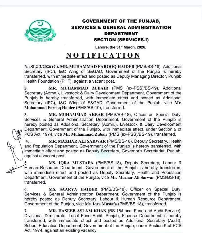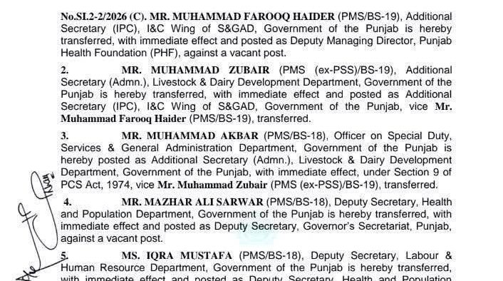 لاہور (ڈیجیٹل پوسٹ) پنجاب حکومت میں بڑے پیمانے پر افسران کے تقرر و تبادلے کر دیے
