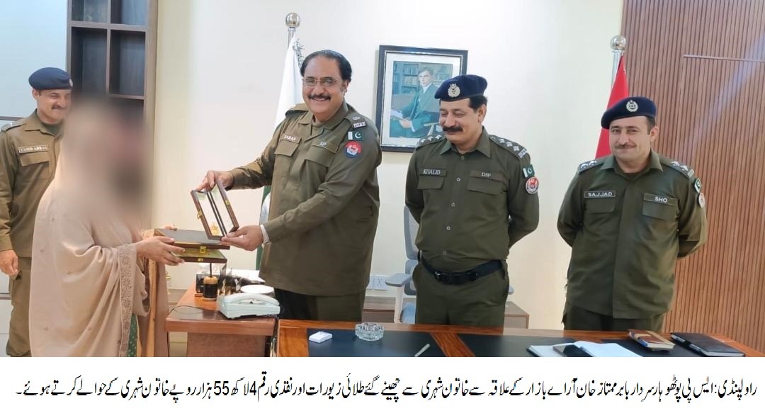 راولپنڈی (ڈیجیٹل پوسٹ) ایس پی پوٹھوہار سردار بابر ممتاز خان نے آراے بازار کے علاقہ سے خاتون شہری سے چھینے گئے طلائی زیورات اور نقدی رقم 4 لاکھ 55 ہزار روپے خاتون شہری کے حوالے کر دئے