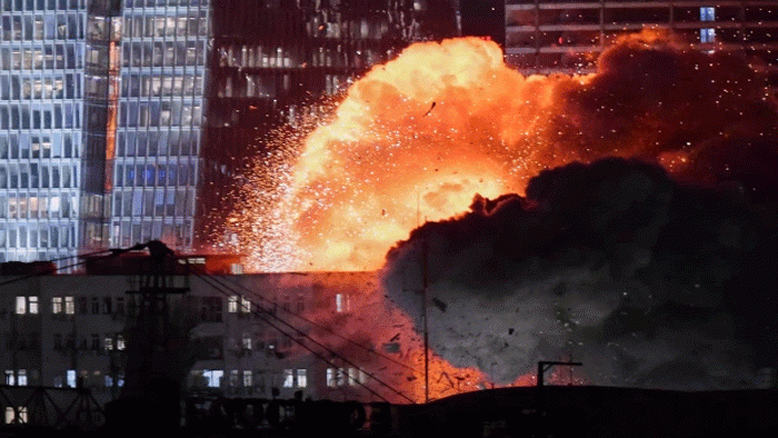 میڈیا رپورٹس میں بتایا جارہا ہے کہ بلند و بالا عمارت کے قریب دھماکے کی آواز اور آگ کا بڑا گولہ فضا میں اٹھتا دکھائی دیا۔