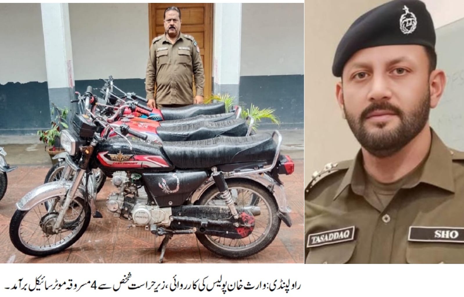 راولپنڈی (ڈیجیٹل پوسٹ) ایس ایچ او تھانہ وارث خان راجہ تصدق کی سربراہی میں پولیس کا جرائم پیشہ افراد کیخلاف کریک ڈاؤن جاری ۔ موٹرسائیکل چوری کی وارداتوں میں ملوث شخص گرفتار 4 مسروقہ موٹرسائیکل برآمد ۔ جرائم پیشہ عناصر کیخلاف بلاتفریق کاروائیاں جاری رہیں گی ( ایس ایچ او وارث خان راجہ تصدق ) تفصیلات کے مطابق ایس ڈی پی او وارث خان سركل رانا نعیم کی زیرنگرانی ایس ایچ او وارث خان کی سربراہی میں پولیس ٹیم نے علاقے میں جرائم پیشہ عناصر کیخلاف کریک ڈاؤن میں موٹر سائیکل چوری کی وارداتوں میں ملوث شخص کو گرفتار کر لیا دوران تفتیش گرفتار شخص سے 4 مسروقہ موٹر سائیکل برآمد ہوئے ، ایس پی راول سعد ارشد نے وارث خان پولیس ٹیم کو شاباش دیتے ہوئے کہا کہ زیرحراست شخص کو ٹھوس شواہد کے ساتھ چالان عدالت کیا جاۓ گا