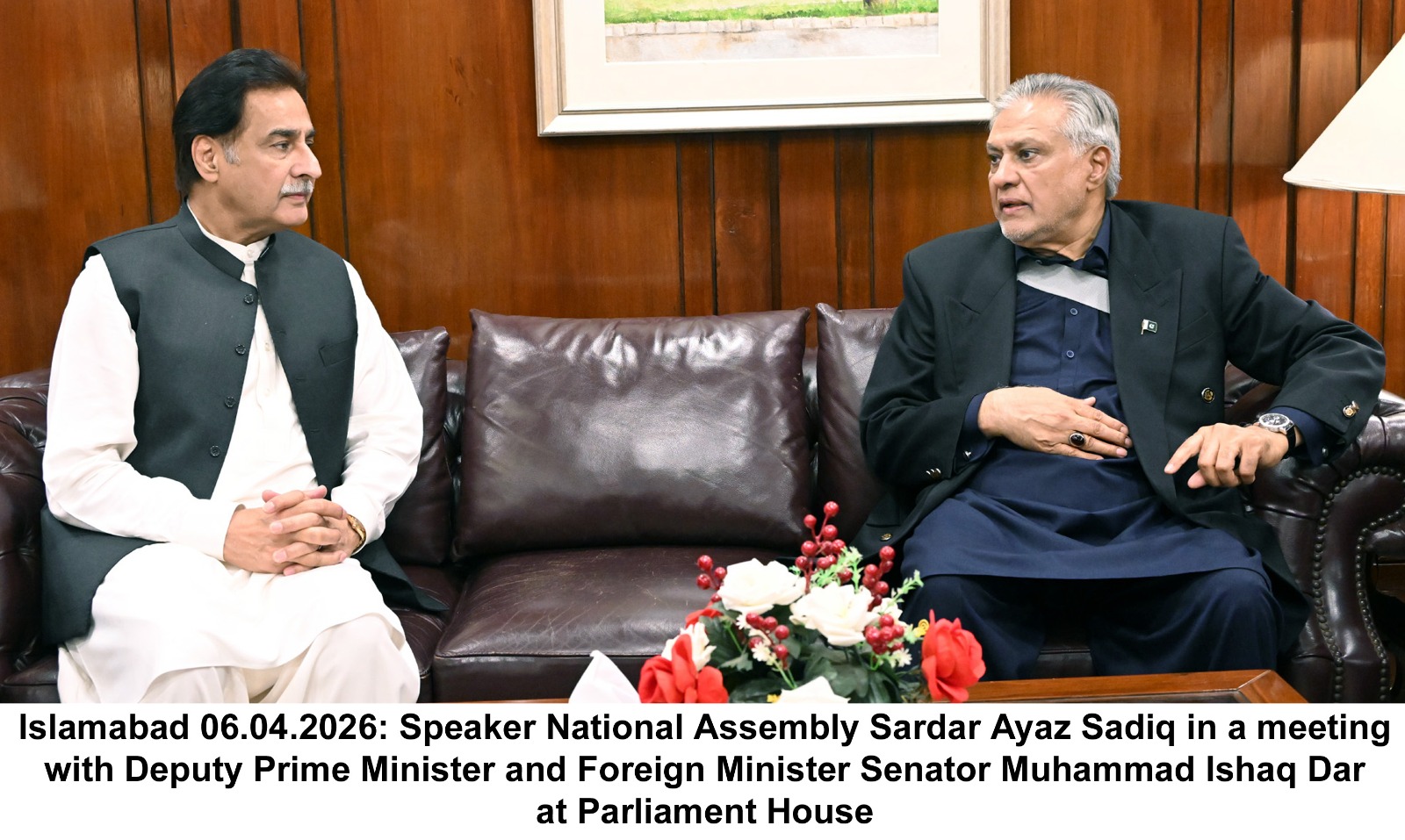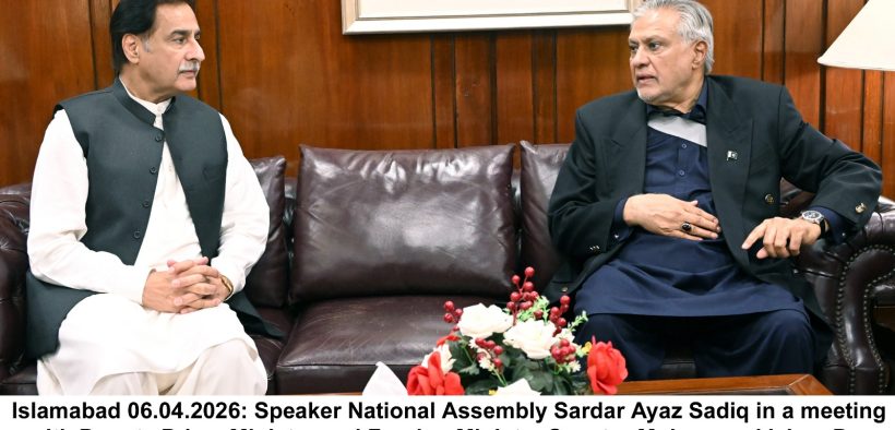 Islamabad, 6 April 2026 (Digital Post): Speaker National Assembly Sardar Ayaz Sadiq called on Deputy Prime Minister/Foreign Minister Senator Ishaq Dar at Parliament House on Monday. During the meeting, matters of mutual interest and the overall regional situation were discussed in detail.
