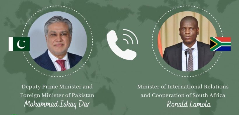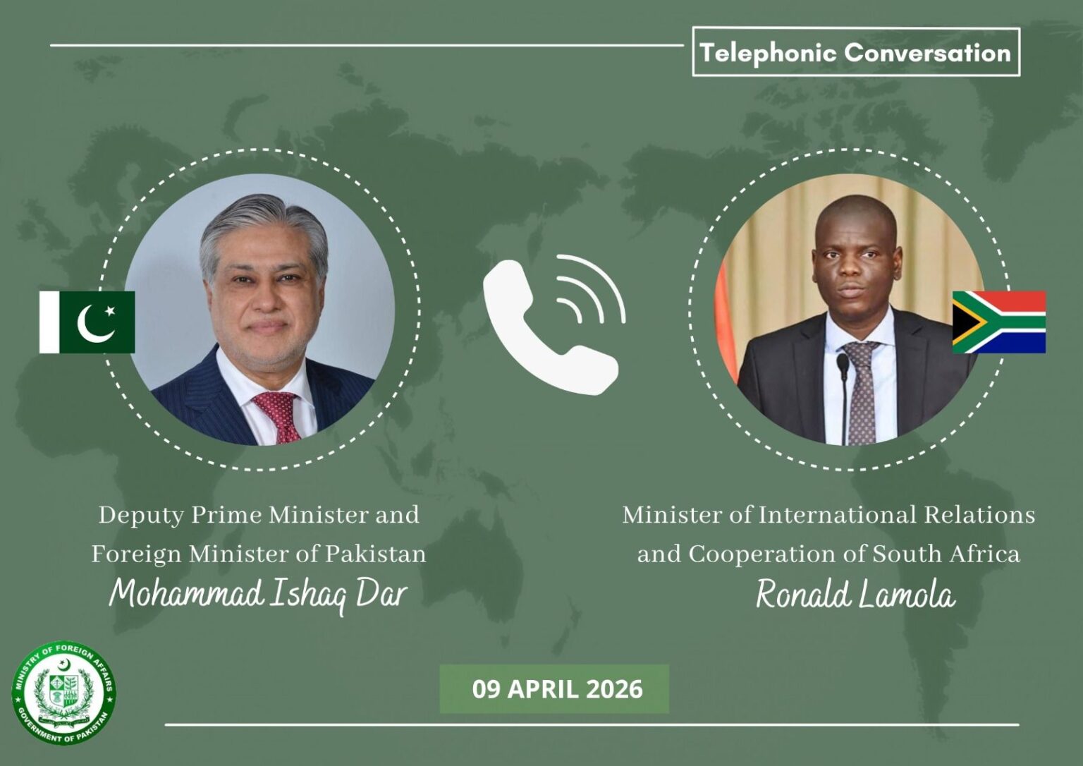 اسلام آباد (ڈیجیٹل پوسٹ) نائب وزیرِ اعظم،وزیرِ خارجہ سینیٹر محمد اسحاق ڈار نے آج جنوبی افریقہ کے وزیر برائے بین الاقوامی تعلقات و تعاون، رونالڈ لامولا کے ساتھ ٹیلیفون پر گفتگو کی۔دونوں رہنماں نے مشرقِ وسطی اور وسیع تر خطے میں ہونے والی تازہ پیش رفت پر تبادلہ خیال کیا۔