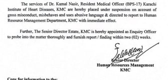 کراچی (ڈیجیٹل پوسٹ) انسٹیٹیوٹ آف ہارٹ ڈیزیزز کے افسر اور اہلکار کو معطل کر دیا گیا ہے۔