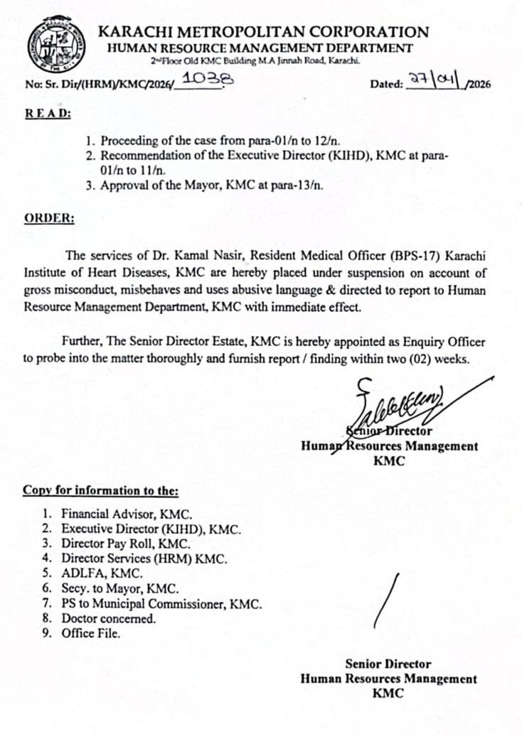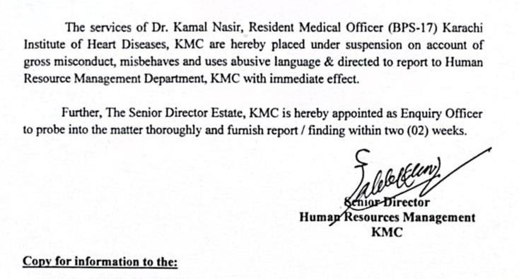 The services of Dr. Kamal Nasir, Resident Medical Officer (BPS-17), Karachi Institute of Heart Diseases, KMC, have also been suspended on charges of serious misconduct, misbehavior, and the use of abusive language. He has been directed to report immediately to the Human Resource Management Department, KMC.