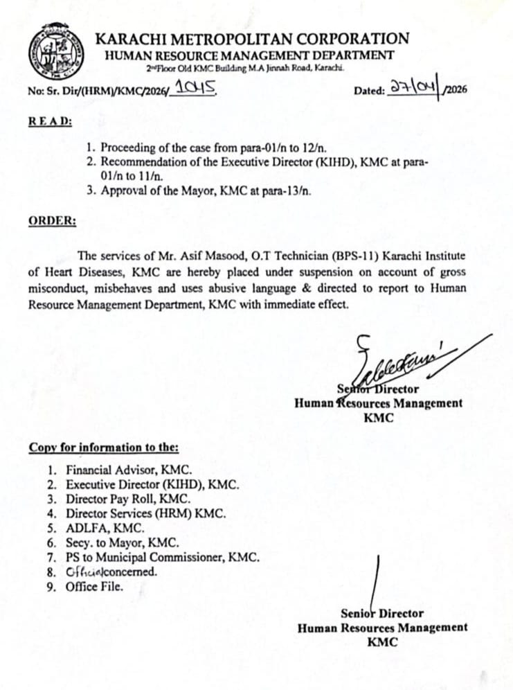 Karachi (Digital Post) Karachi An OT Technician, Mr. Asif Masood (BPS-11), posted at the Karachi Institute of Heart Diseases under the Karachi Municipal Corporation (KMC), has been suspended with immediate effect on allegations of serious misconduct, inappropriate behavior, and the use of improper language.