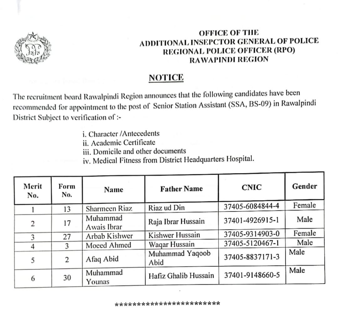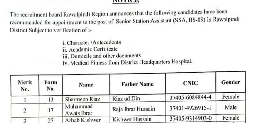 BREAKING NEWS National راولپنڈی(ڈیجیٹل پوسٹ) ریجن میں پی ایس اے اور ایس ایس اے کی بھرتی کے لیے کامیاب امیدواران کی حتمی فہرست جاری کردی گئی Dailydigitalpost October 2, 2023 Share راولپنڈی ریجن میں پی ایس اے اور ایس ایس اے کی بھرتی کے لیے کامیاب امیدواران کی حتمی فہرست جاری کردی گئی. راولپنڈی ضلع کے کامیاب ہونے والے امیدواران مزید مراحل(میڈیکل فٹنس ٹیسٹ و دستاویزات ویریفیکیشن وغیرہ) کے لیے رابطہ کریں۔