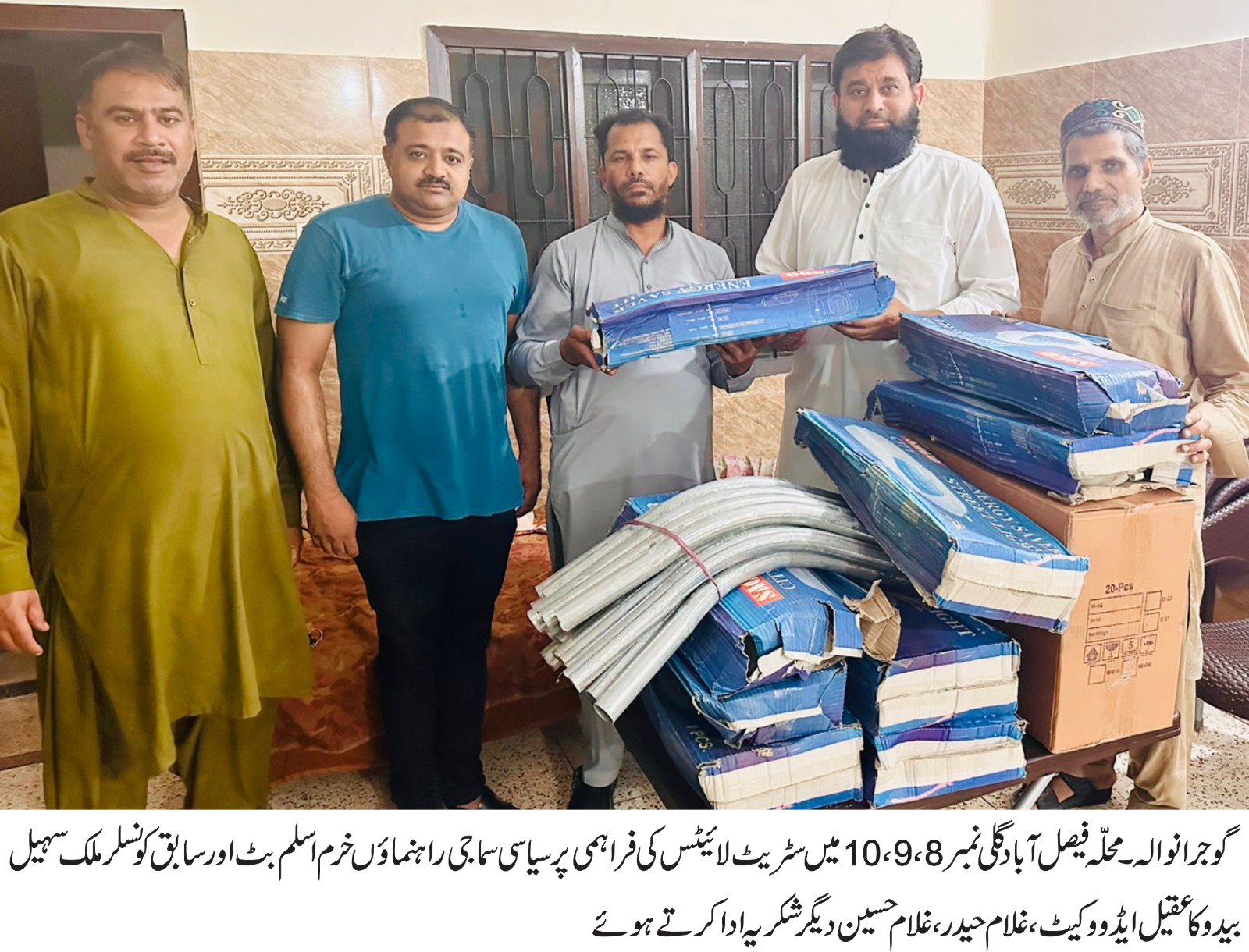 گوجرانوالہ(ڈیجیٹل پوسٹ) محلہ فیصل آباد کی گلیوں میں سٹریٹ لائیٹس کی فراہمی پر اہل علاقہ کا خرم اسلم بٹ اور ملک سہیل احمد عرف بیدو سے اظہار تشکر