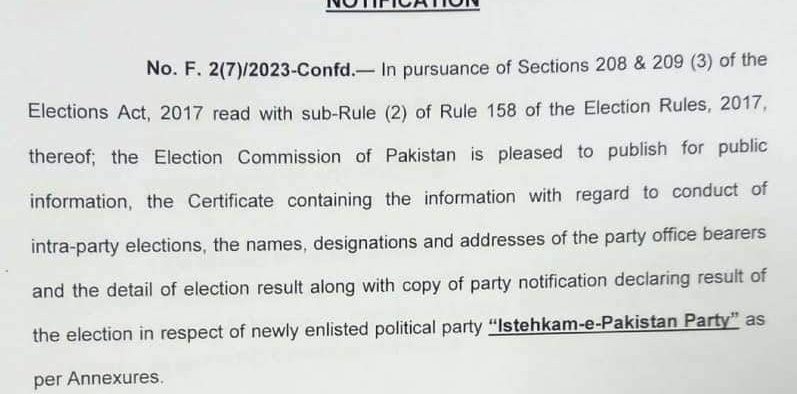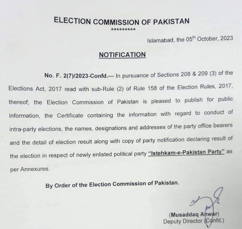 BREAKING NEWS National اسلام آباد (ڈیجیٹل پوسٹ) استحکامِ پاکستان پارٹی کی رجسٹریشن مکمل، الیکشن کمیشن نے نوٹیفیکیشن جاری کردیا۔ Dailydigitalpost October 6, 2023 Share اسلام آباد استحکامِ پاکستان پارٹی کی رجسٹریشن مکمل، الیکشن کمیشن نے نوٹیفیکیشن جاری کردیا۔
