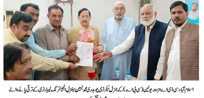 اسلام آباد(ڈیجیٹل پوسٹ) سی ڈی اے مزدور یونین (سی بی اے) کی کاوشوں سے سینٹرل انجینئرنگ لیبارٹری کے فیلڈ اٹینڈنٹ کو جونیئر لیب اسسٹنٹ اور فیلڈ اسسٹنٹ کے عہدوں پر ترقی