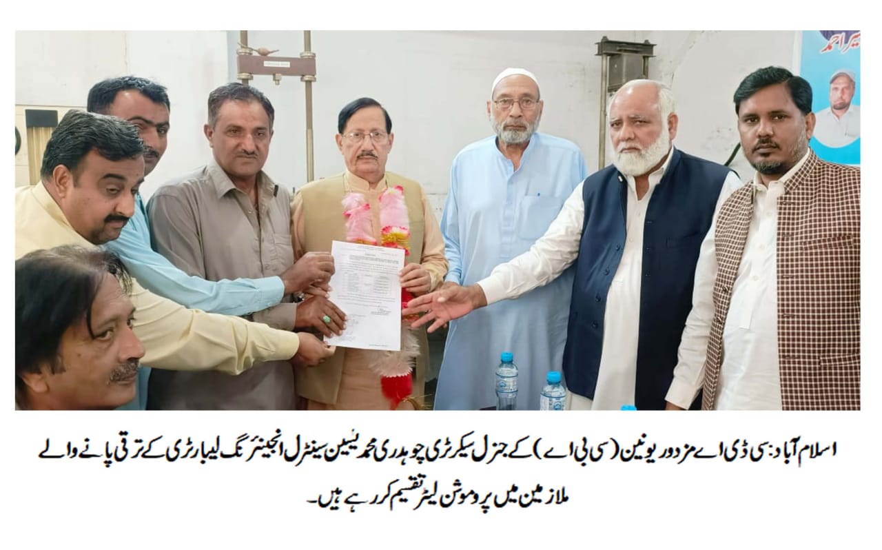 سی ڈی اے مزدور یونین (سی بی اے) کی کاوشوں سے سینٹرل انجینئرنگ لیبارٹری کے فیلڈ اٹینڈنٹ کو جونیئر لیب اسسٹنٹ اور فیلڈ اسسٹنٹ کے عہدوں پر ترقی دے دی گئی،ترقی پانے والوں میں نثاراحمد،ساجد محمود،کلیم اختر،سید خانزادہ،محمد فیضان ودیگر ملازمین شامل ہیں،اسی سلسلے میں ملازمین میں پروموشن لیٹرتقسیم کرنے کے حوالے سے تقریب سینٹرل انجینئرنگ لیبارٹری میں منعقد ہوئی جس میں سی ڈی اے مزدور یونین (سی بی اے) کے جنرل سیکرٹری چوہدری محمد یٰسین،صدر اورنگزیب خان،سپریم ہیڈ صوفی محمود علی،اسد محمود،محمد سرفرازملک،ملک محمد عمران،محمد خان،نصیراحمدسمیت سی ڈی اے ملازمین نے کثیرتعدادمیں شرکت کی،تقریب سے خطاب کرتے ہوئے سی ڈی اے مزدور یونین کے قائد چوہدری محمد یٰسین نے کہا کہ سی ڈی اے مزدور یونین رنگ،نسل اور مذہب سے بالاترہو کر ملازمین کی خدمت پریقین رکھتی ہے اورہم نے ریفرنڈم میں جو وعدے کیے تھے آج الحمد للہ اسکی تکمیل کررہے ہیں،چوہدری محمد یٰسین نے کہا کہ ان مشکل ترین حالات میں ملازمین کو 20فی صد مہنگائی الاؤنس دلوایا اور تمام الاؤنسزمیں 50سے 100فی صد اضافہ کروایا جبکہ نام نہادلیڈروں نے اپنی دیہاڑی لگانے کے علاوہ مزدوروں کے لیے کچھ نہیں کیا اور پلاٹوں کے نام پر ملازمین کو بیوقوف بناتے رہے اور دوسری طرف بے روزگارنام نہادلیڈراپنی نوکری پکی کرنے کے لیے سیاسی بیساکھیوں کا سہارالے رہا ہے لیکن وہ اس مقصد میں کامیاب نہیں ہو سکیں گے، اس موقع پرچوہدری محمد یٰسین نے کہا کہ ہم چیئرمین سی ڈی اے اورانتظامیہ سے مطالبہ کرتے ہیں کہ چارٹر آف ڈیمانڈ سمیت ایجنڈا میٹنگ فوری بلائی جائے اور سی بی اے کے ساتھ مزدوروں کے مسائل پر گفت و شنید کی جائے تاکہ مزدوروں میں پائی جانے والی بے چینی کا خاتمہ ہو سکے۔