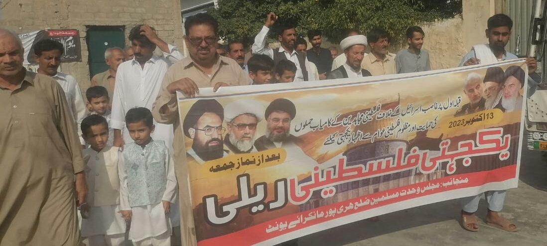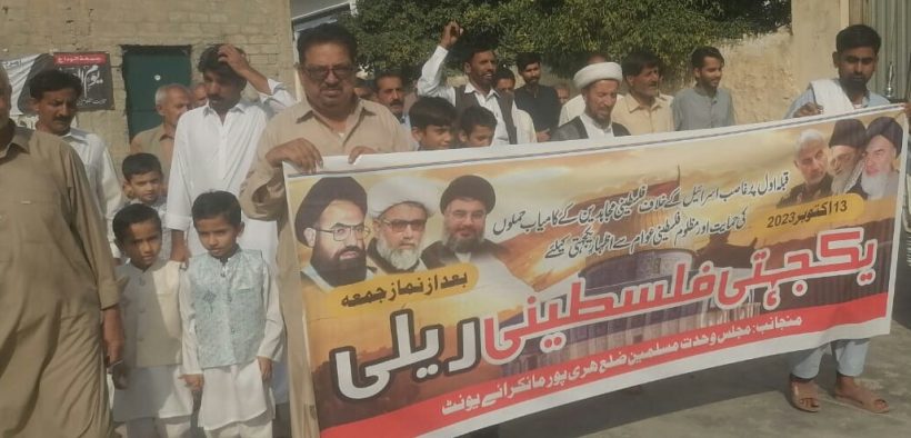 On the direction of the central chairman of Majlis Wahdat Muslimeen Pakistan, Hujta Salaam Wala Muslimeen Allama Raja Nasir Abbas Jafari, protests were held throughout the country to express solidarity with the Palestinian people. The main procession was taken out from the mosque under the leadership of District Khatib Hujta-salam-ul-Muslimin Allama Habib Amini, Provincial President Majlis Wahdat Muslimeen Azadari Wing Khyber-Pakhtunkhwa Nair Abbas Jafari, District President Muhammad Ishaq Haidari and Salar Haidari Shah of the Mourning Squad in Mankara. He came to the Imam Bargah and took the form of a protest meeting. Apart from this, protests were also held in Haripur Imamiya Masjid, Kohmal Syedan Tehsil Khanpur, village Kohala Tehsil Khanpur and Dobandi Syedan Khanpur. These protests were addressed by various speakers. Among those who spoke in different areas were the Provincial President Majlis Wahdat Muslimeen Azadari Wing Khyber Pakhtunkhwa Nair Abbas Jafari, District Khatib Hujta Salam Wal-Muslimeen Allama Habib Amini and Allama Mukhtiar Hussain and other speakers. According to the decree of Quaid-e-Azam Muhammad Ali Jinnah, proud Pakistanis cannot recognize the existence of Israel under any circumstances. Oppressed Palestinians have chosen the path of resistance and with the power of faith have come down to the field to answer the atrocities of the years. Just as today’s disbelief stands like a rock with Israel, Muslims should also stand firm with the Palestinian people and give a toothless response to disbelief and liberate Jerusalem and the Palestinian territories from the impure existence of Israel. Israel’s aggression is continuously increasing and thousands of children, sisters and daughters are looking towards the Muslim Ummah. All Muslim countries should come together to help the Palestinians. Pakistan can play an important role in this regard. The need of the hour is that the entire Muslim Ummah should generously help the Palestinian people in every way