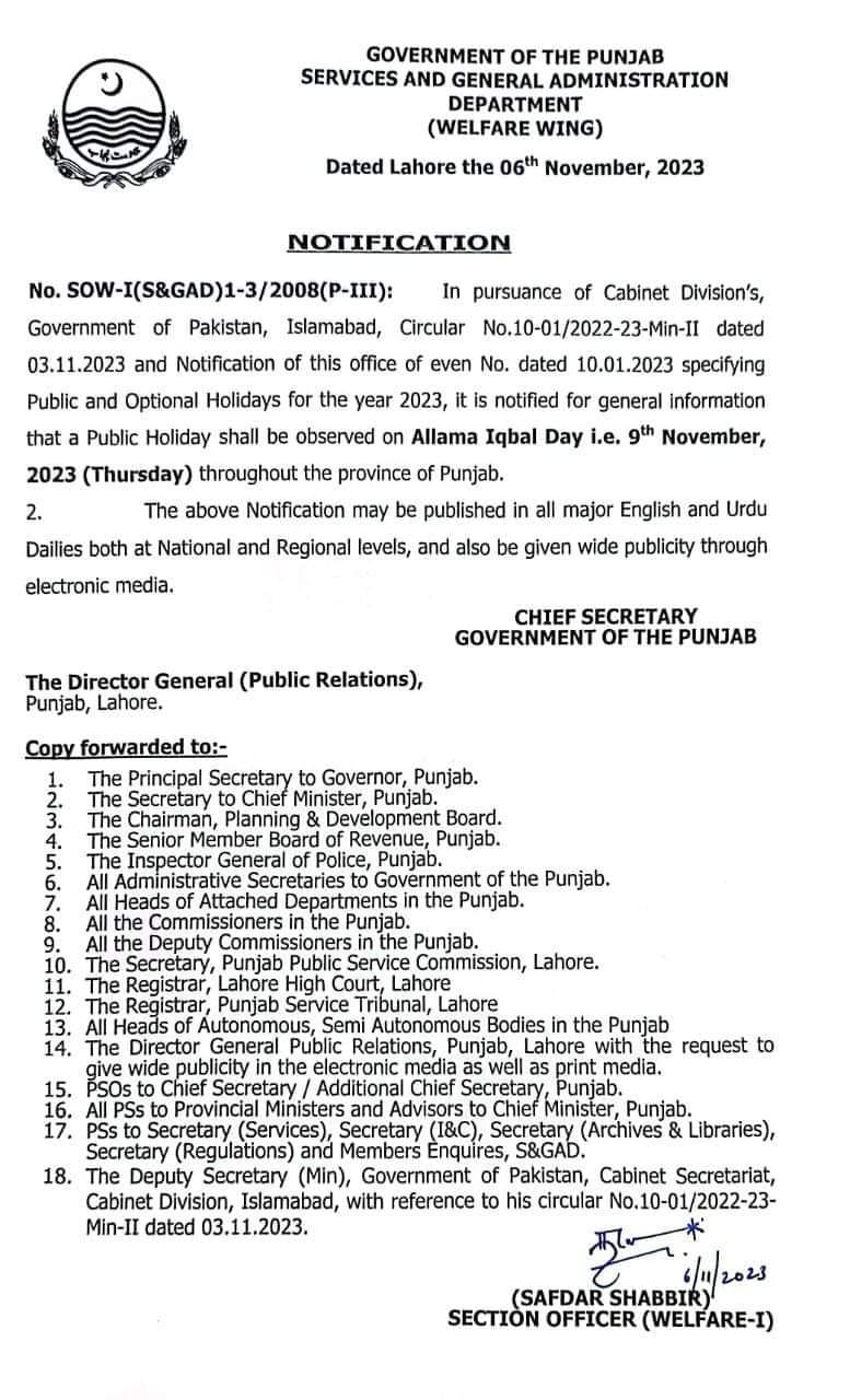 BREAKING NEWS لاہور(ڈیجیٹل پوسٹ) 9 نومبر کو پنجاب میں بھی عام تعطیل ہو گی’ وفاقی حکومت کے بعد پنجاب حکومت نے نوٹیفکیشن جاری کر دیا Dailydigitalpost November 7, 2023 Share لاہور 9 نومبر کو پنجاب میں بھی عام تعطیل ہو گی’ وفاقی حکومت کے بعد پنجاب حکومت نے نوٹیفکیشن جاری کر دیا