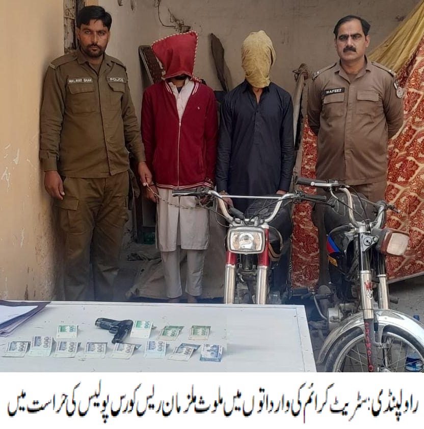 راولپنڈی( )ایس ایچ او تھانہ ریس کورس راجہ افتخار کی ہمراہ پولیس ٹیم اہم کاروائی، سٹریٹ کرائم کی وارداتوں میں ملوث دو رکنی گینگ گرفتار، 02مسروقہ موٹر سائیکل،موٹر سائیکل کے سپیئر پار ٹس،رقم10ہزار روپے اور وارداتوں میں استعمال ہونے والا اسلحہ برآمد۔تفصیلات کے مطابق ریس کورس پولیس نے سٹریٹ کرائم کی وارداتوں میں ملوث دو رکنی گینگ کو گرفتارکر لیا،گرفتار ملزمان میں گینگ کا سرغنہ ہارون اور فاروق شامل ہیں،ملزمان سے 02مسروقہ موٹر سائیکل،موٹر سائیکل کے سپیئر پار ٹس،رقم10ہزار روپے اور وارداتوں میں استعمال ہونے والا اسلحہ برآمدہوا،ملزمان کو متعدد وارداتوں کے انکشاف پر شناخت پریڈ کے لیے جیل منتقل کیا گیا ہے، ایس پی پوٹھوہار محمد وقاص خان کا کہنا تھا کہ شناخت پریڈ کے بعد ملزمان سے مزید برآمدگی کا تحرک کیا جائے گا،شہریوں کی جان ومال پر حملہ کرنے والے ملزمان قانون کی گرفت سے نہیں بچ سکتے۔